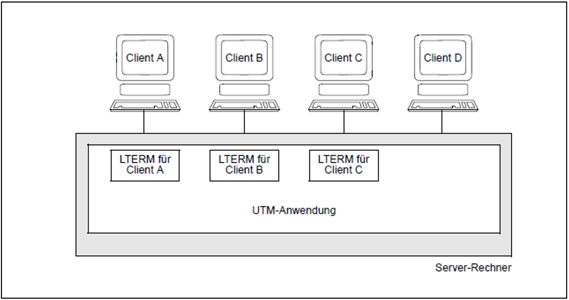 Bei der in Bild 32 dargestellten Beispiel-Konfiguration könnten die Clients A, B und C mit der UTM-Anwendung arbeiten. Obwohl auch Client D über eine Leitung zum Server-Rechner verfügt, hat er keinen Zugang zur UTM-Anwendung, weil ihm in der Konfiguration der Anwendung kein LTERM-Partner zugeordnet ist.