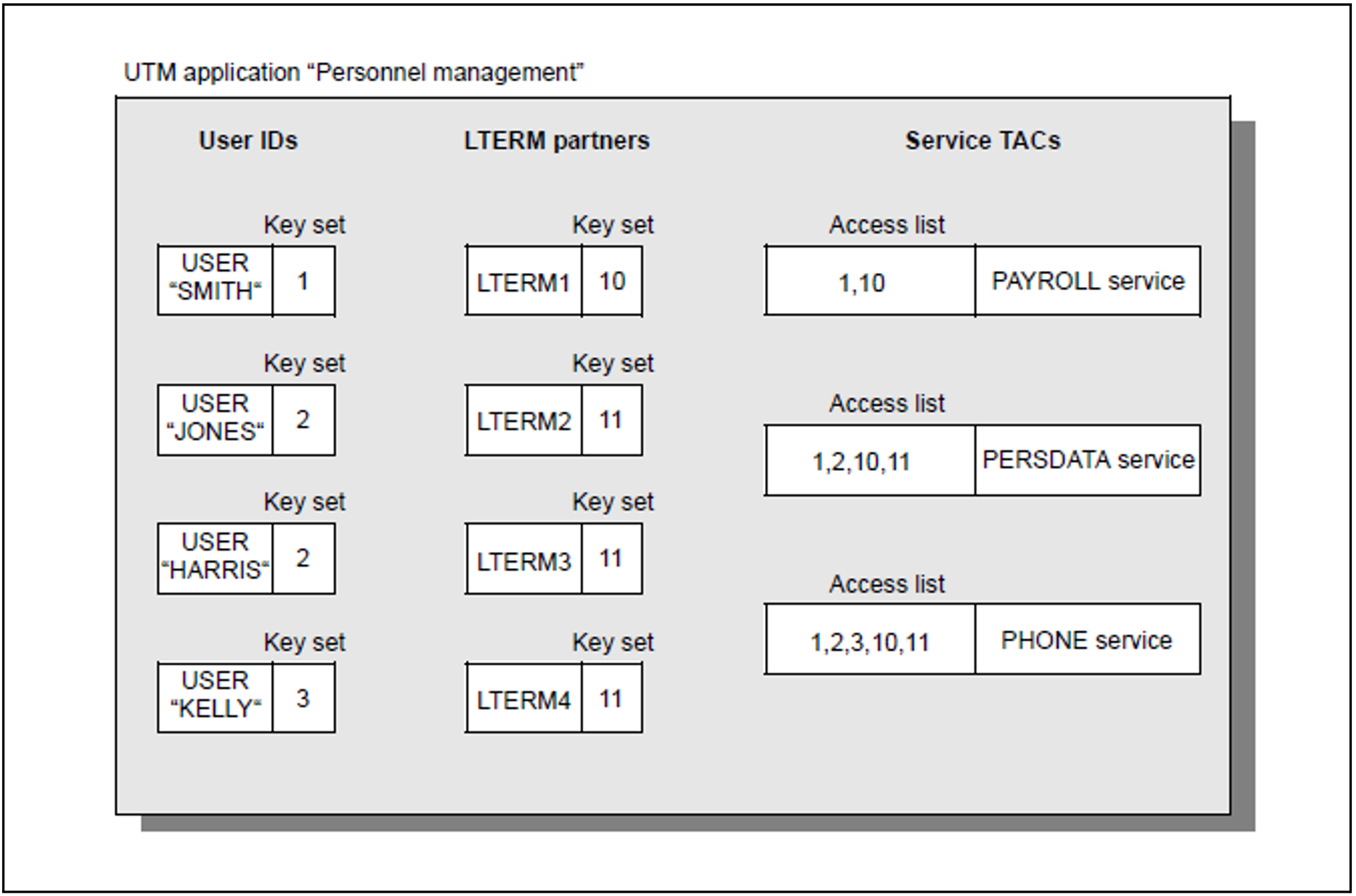 A user can only start a service when the key set of the user ID and the key set of the LTERM partner via which the user signs on contain a key contained in the access list of the service: