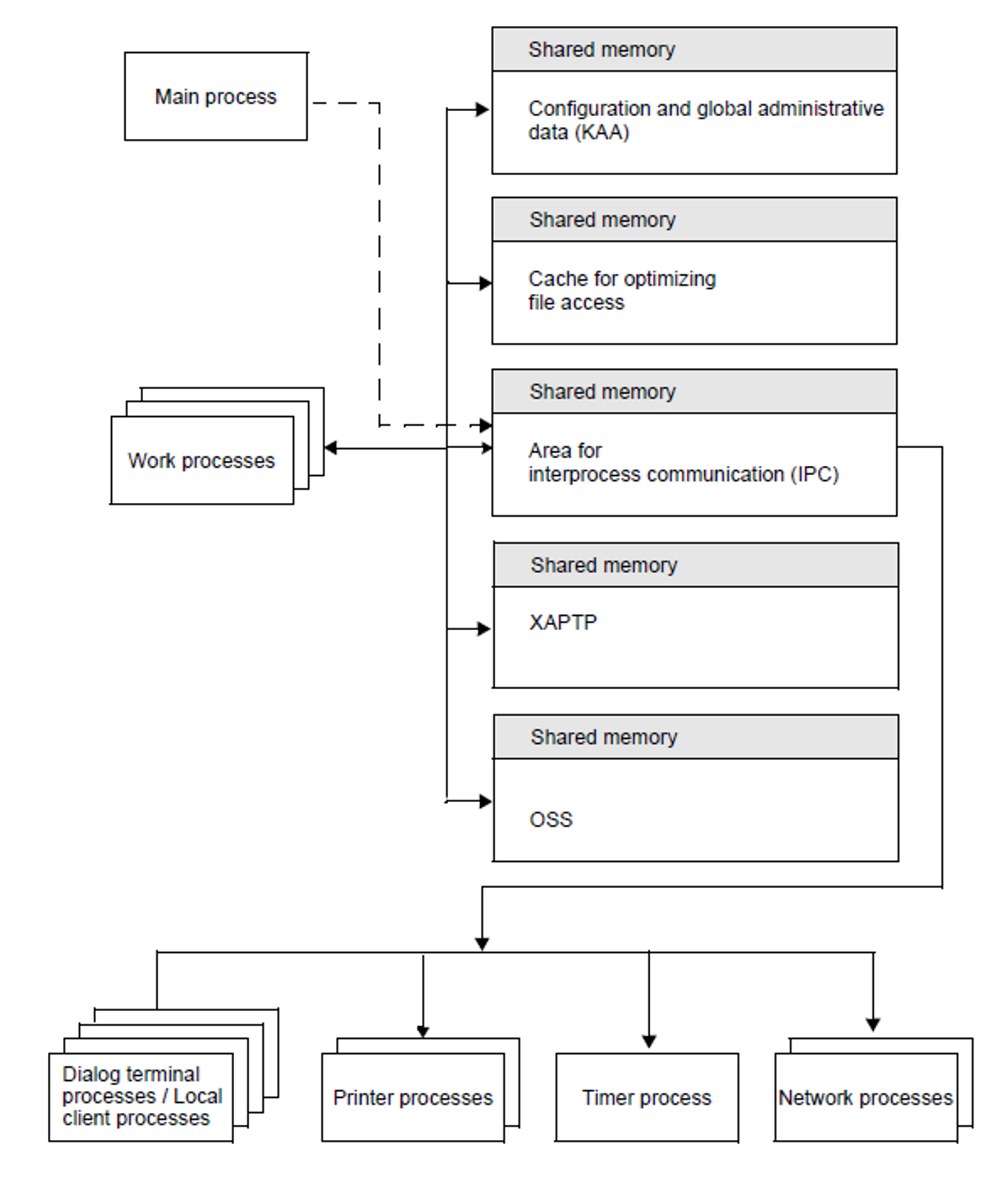 Work processes and external processes (dialog terminal, printer, network processes and timer process as well as local client processes) use the same shared memory area for interprocess communication (IPC) and job processing.