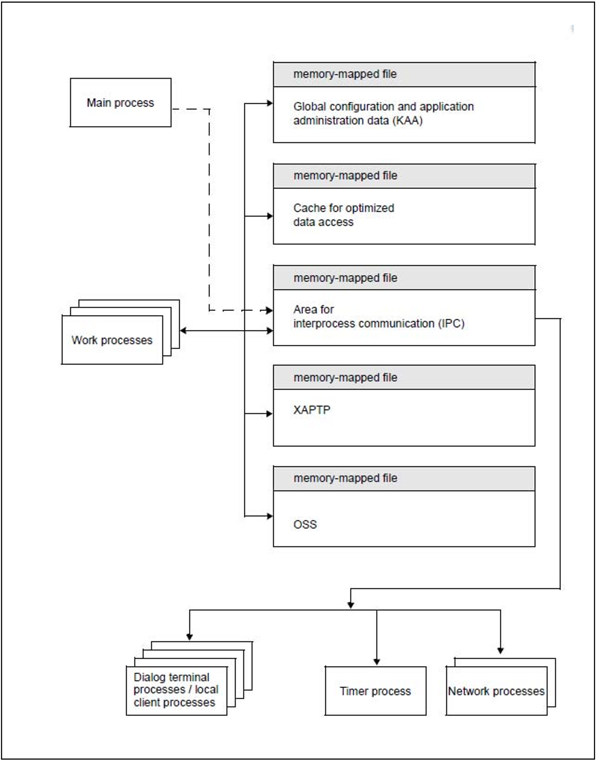 Work processes and external processes (dialog terminal processes, network processes, the timer process and the local client process) share a memory-mapped file area for IPC (Inter-Process Communication) and for job processing.