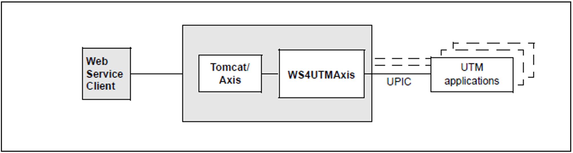 WS4UTMAxis is a package of classes loaded by Axis that fulfill the function of a provider. WS4UTMAxis uses then openUTM-JConnect product for calling a service of the corresponding UTM application. The communication is carried out via the UPIC protocol.
