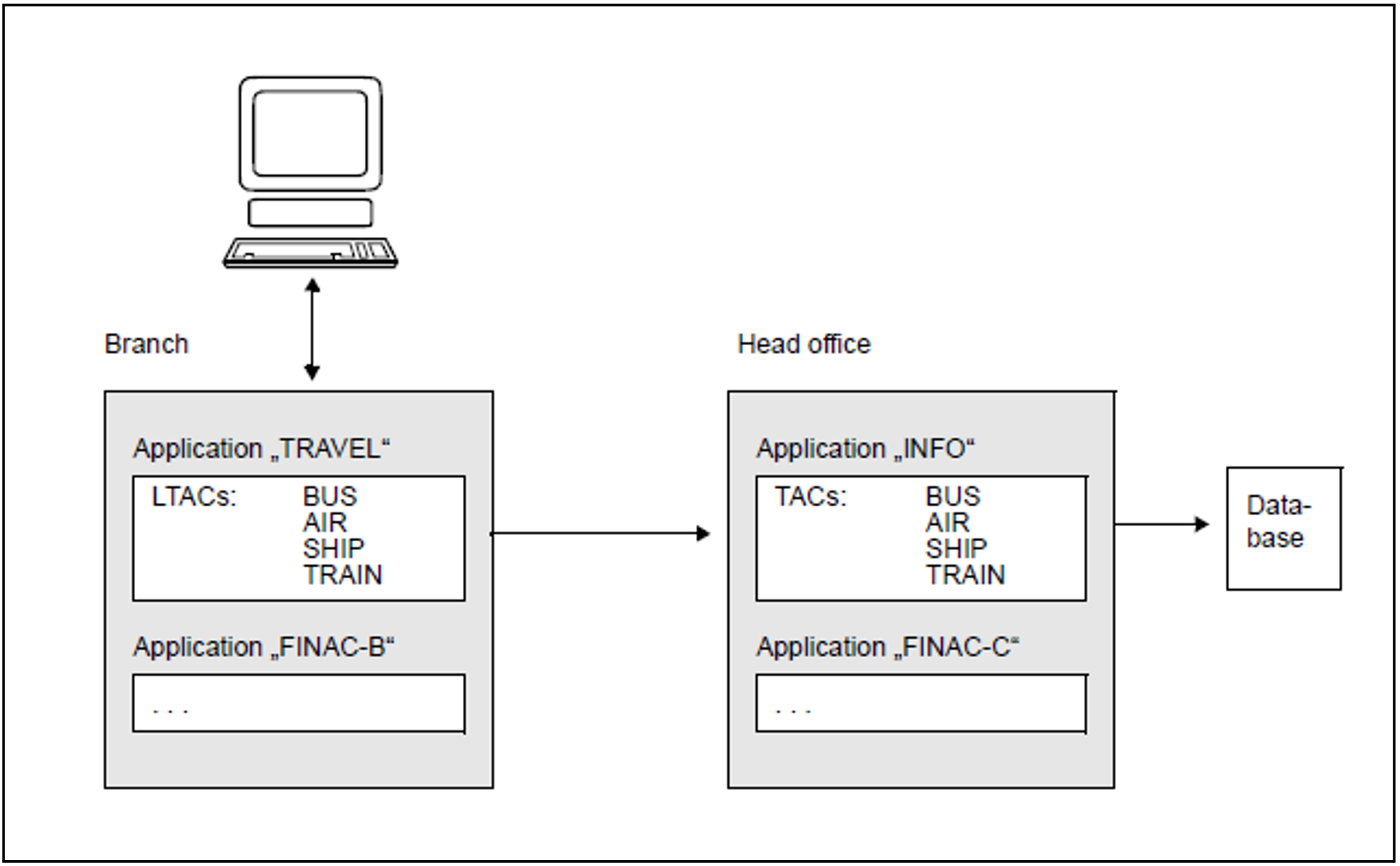 The branch offices of a travel agency use the UTM application “TRAVEL”, which retrieves the required information from the UTM application “INFO” in head office. The individual services with the logical names “BUS”, “AIR”, “SHIP” and “TRAIN” were linked to the “INFO” application during generation. It is therefore sufficient to specify the logical service name in the program. The logical name of the partner application need not be specified in the program.