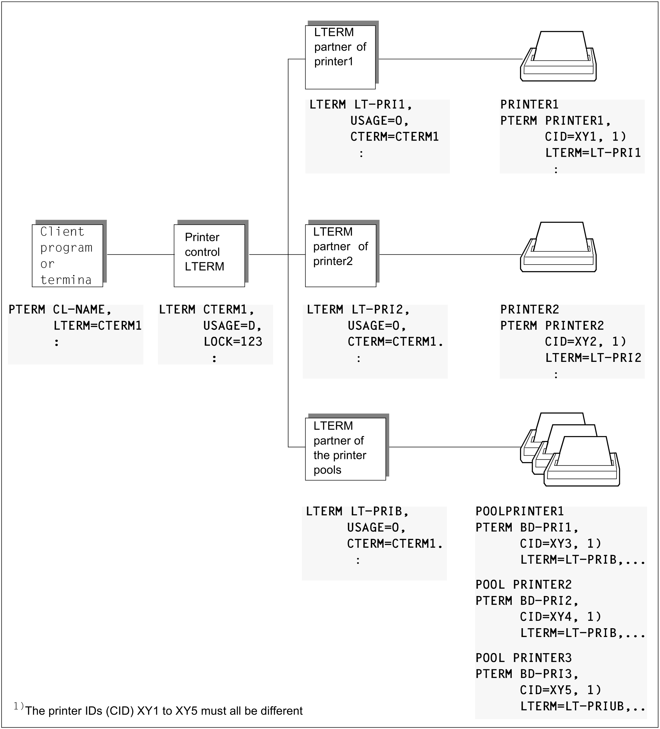 You can assign individual printers and even printer pools to one printer control LTERM. You must define a printer ID for each printer to which a printer control LTERM is assigned. This printer ID must be unique in the printer control LTERM range because the printer control LTERM uses this printer ID to address the printers directly. You must pay particular attention to the unique nature of each printer ID in printer pools. You must also define a separate printer ID for each of the printers in the pool. These printer IDs must be assigned to the correct printers when they are entered in the configuration.