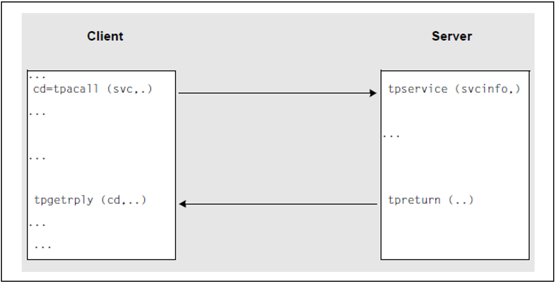 With this paradigm, communication is handled in two steps. In the first step, a tpacall() call is used to address the service and send the message. In the second step the response is fetched with tpgetrply() at a later stage, see diagram below.
