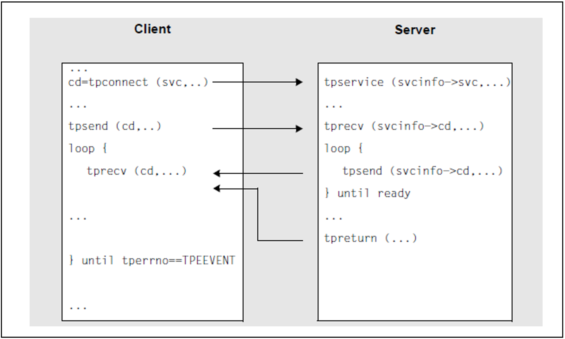 In the conversational paradigm, the conversation is explicitly established to a service with the tpconnect call. As long as the conversation exists, the client and server can exchange data with tpsend and tprecv. However, this “dialog” is not a dialog in the sense of OSI TP, and only one transaction can be processed.