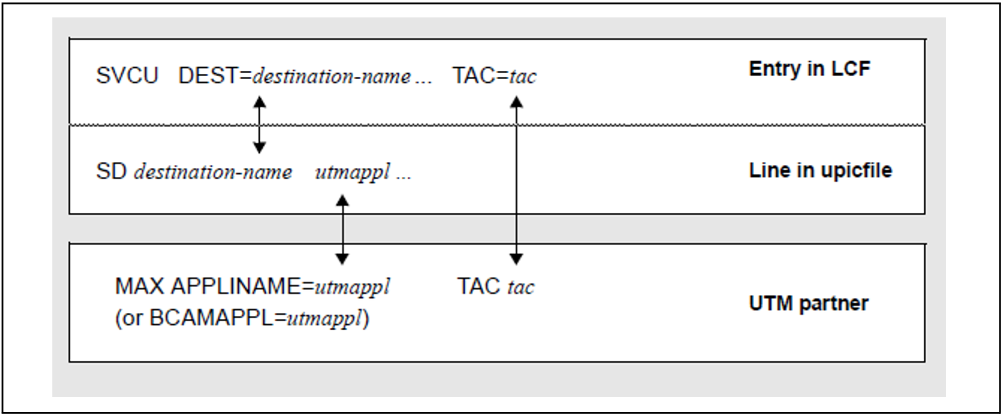 utmappl is the name of the UTM application, as configured with the KDCDEF statements MAX APPLINAME or BCAMAPPL=. Address information, such as IP address and port number, must be specified in the upicfile. With UTM applications on BS2000 systems, no UPIC communication can be made via the application name defined with MAX APPLINAME, since this is defined with T-PROT = NEA.