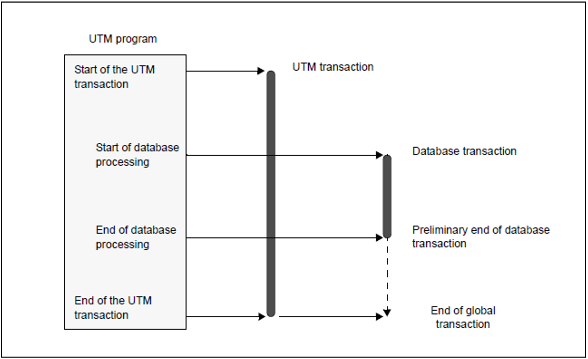 The UTM transaction and the database transactions can therefore be regarded as subsets of a global transaction. The global transaction cannot be terminated successfully until all of its subsets have been completed. If one of the subsets- either a UTM transaction or a database transaction - cannot be concluded, the global transaction is rolled back. This means that all changes made in the databases and the UTM storage areas by the transaction are reversed, and the asynchronous and output services called are canceled.