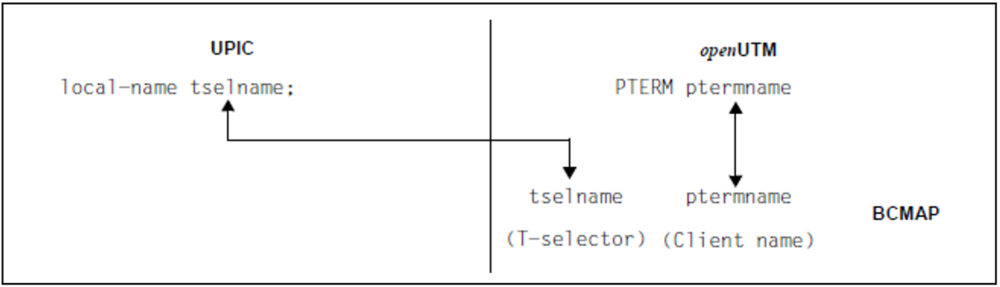 The following relationships exist between the entries in the client program or in the upicfile and the configuration of the UTM application.