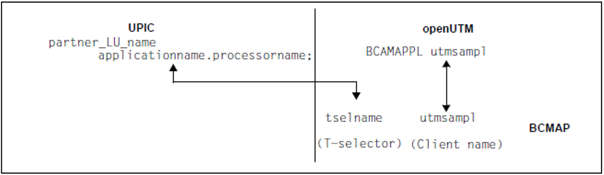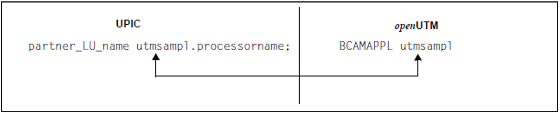 The applicationname which UPIC transfers to the transport system must match the BCAMAPPL name of the UTM application via which the connection to the client is made (in the diagram this is utmsampl). processorname must be entered in the TCP/IP name service as the name of the remote system.