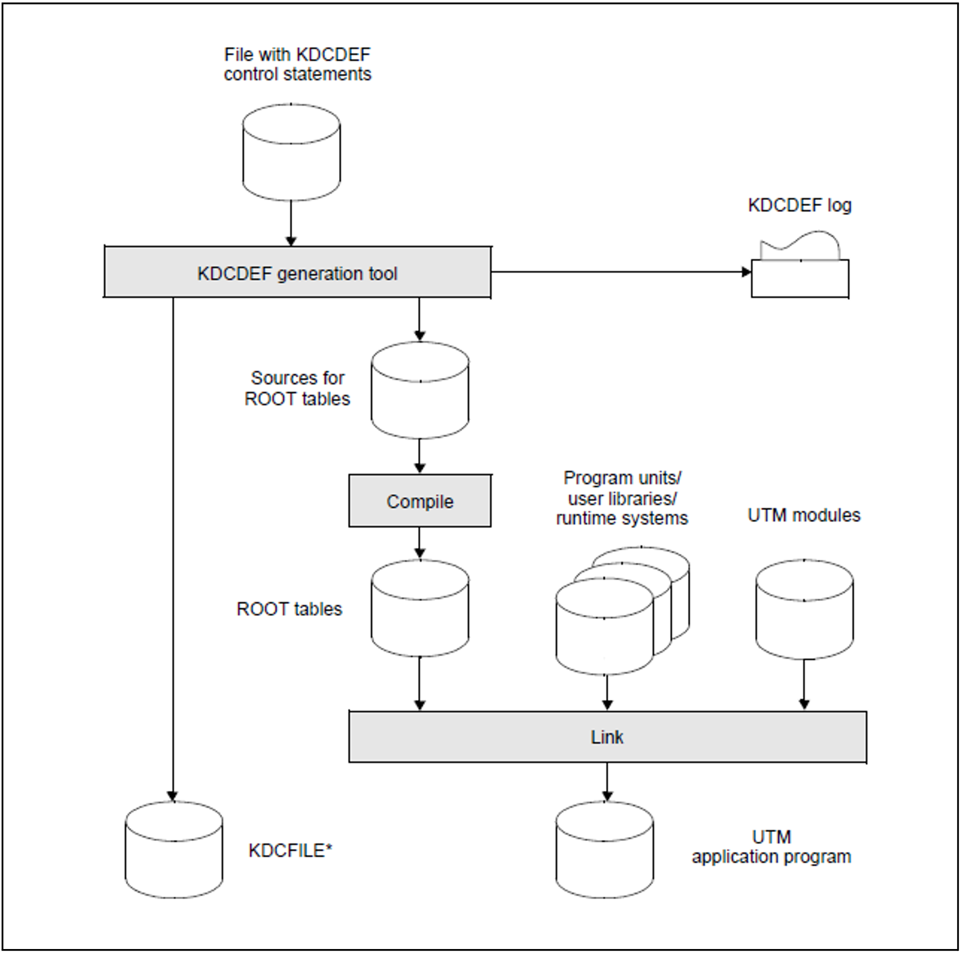 linking the compiled ROOT tables, program units, and any other modules (e.g. format libraries, local message modules, or language-specific runtime systems) to the application program together with UTM modules. This can be done statically (i.e. before the application is started) or dynamically (i.e. when the application is started).