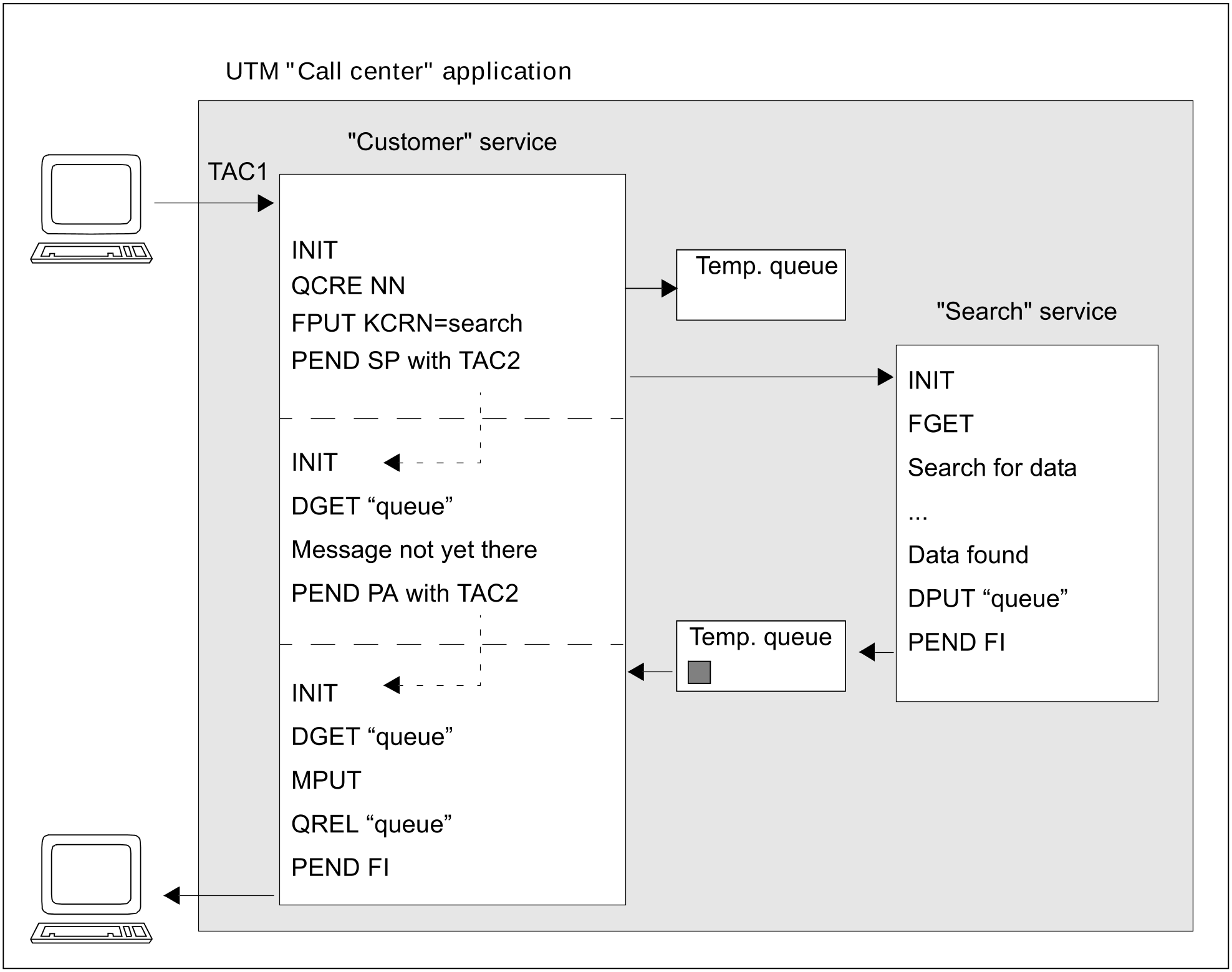 A temporary queue is created by means of QCRE NN. The name of the queue is returned in KCRQN. The background job “Search” is then created with FPUT, and the transaction is terminated immediately with PEND SP. The name of the queue is passed with FPUT.