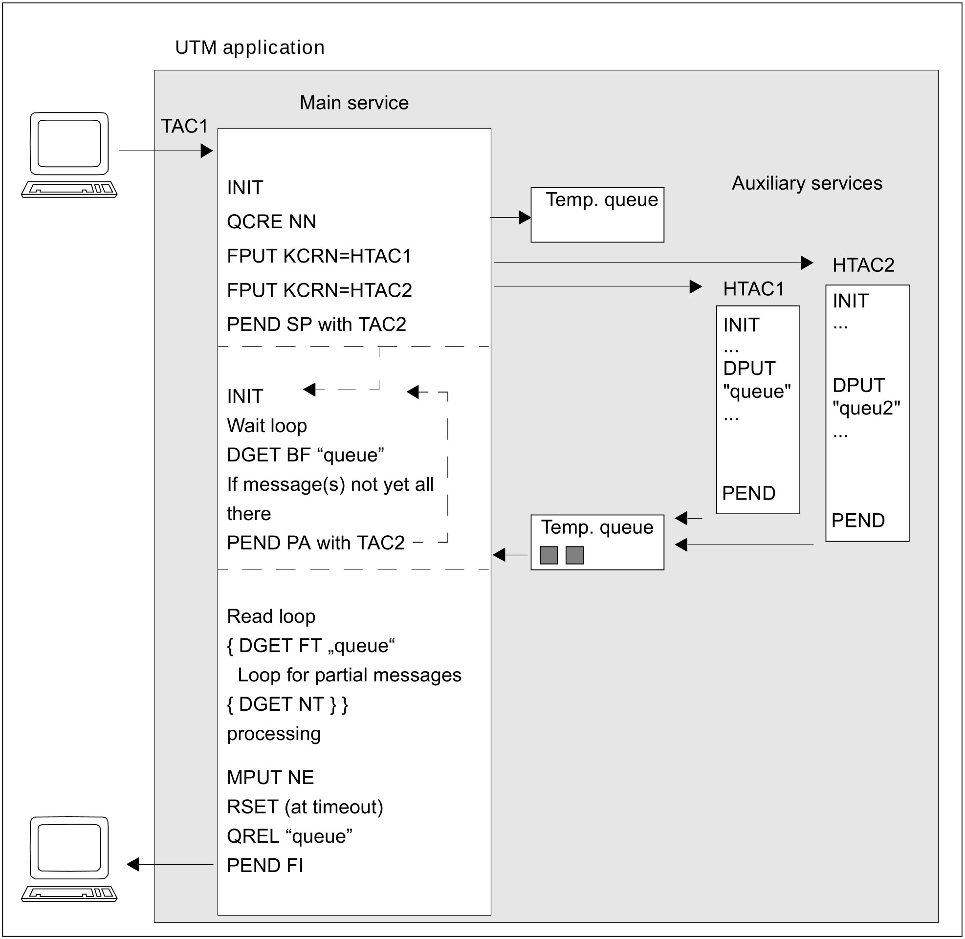 A communication partner of the type APPLI or SOCKET-USP replaces the auxiliary service of example 1. The FPUT call in the main service addresses the LTERM name of the remote application instead of an asynchronous TAC; apart from this change, the calls and processes involved in the two services remain unchanged. If the remote application is a UTM application, the TAC to be called in the remote application must be at the beginning of the FPUT message. The remote application must begin its reply message with the name of the queue in which the main service expects the reply.