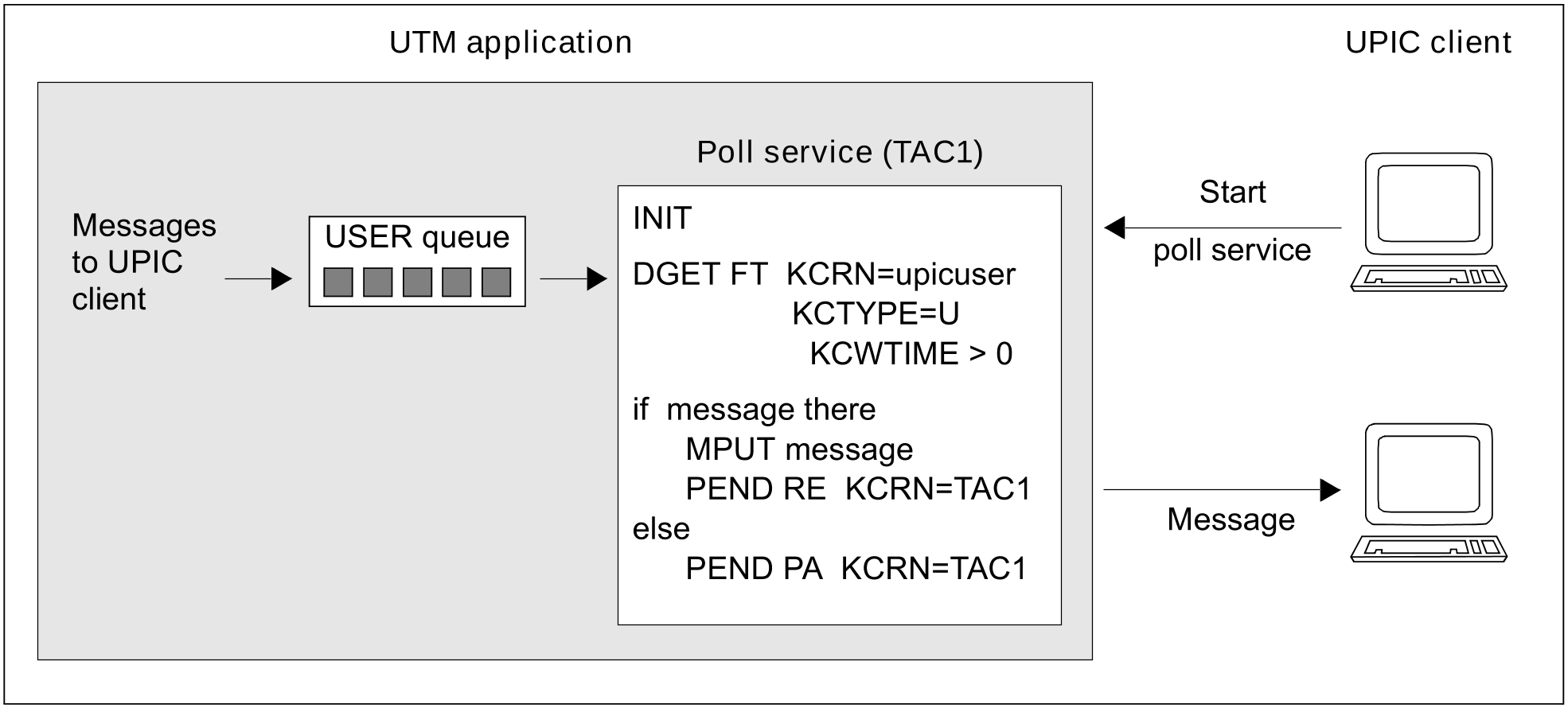 Asynchronous messages must not be directed at a LTERM partner of a UPIC client; with the help of service-controlled queues, however, asynchronous events or messages can also be delivered to a UPIC client. To do this, you either direct the asynchronous messages to the USER queue of the UPIC client or you generate a TAC queue additionally for each UPIC client. The UPIC client starts another dialog service in parallel with its normal dialog services. This dialog service assumes the task of waiting at this queue until a message arrives, reading it out and forwarding it to the UPIC client.