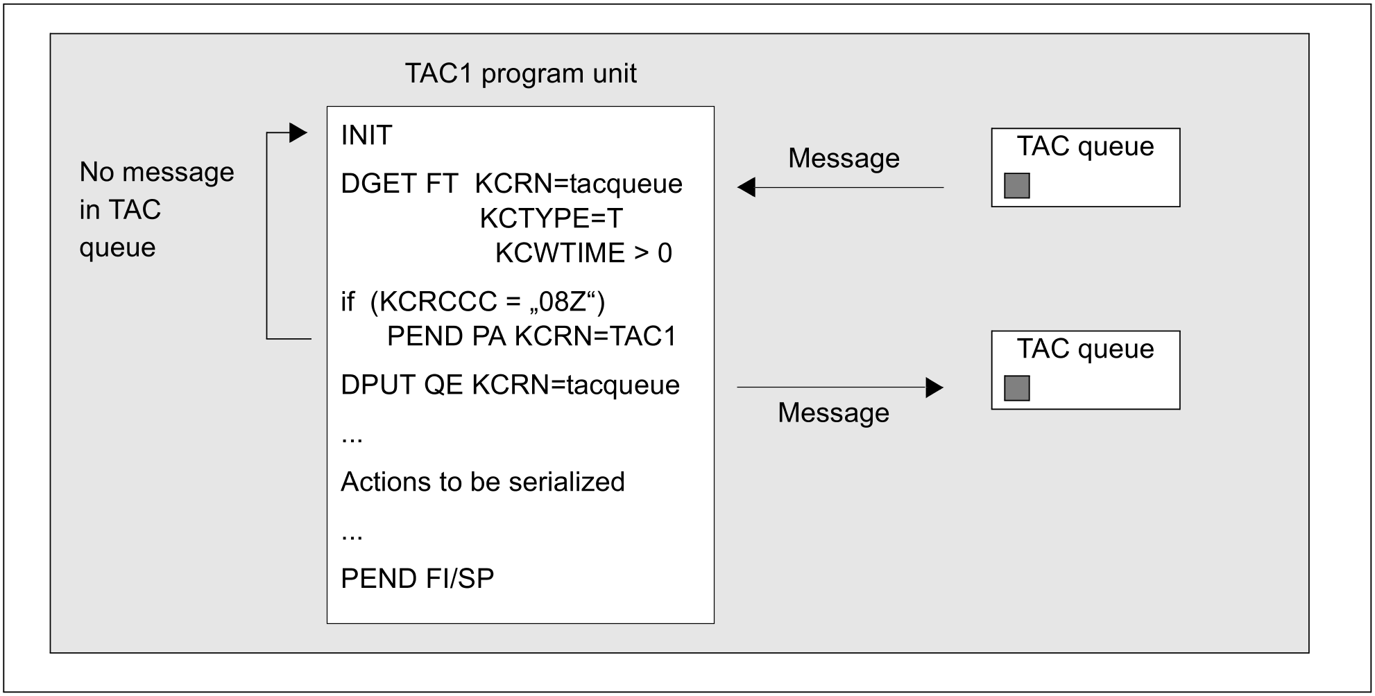 A message is sent to the TAC queue by means of DPUT for the next service to execute the critical program segment. Only on successful completion of the transaction does the DPUT call take effect.