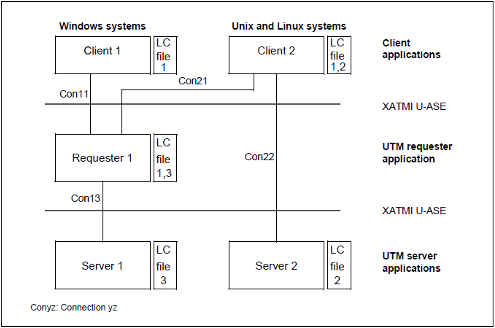 The diagram below shows the connection of client/server applications, linking the client, server and requester. They exchange their type-encoded data structures (typed buffers) in accordance with the protocol of the “XATMI U-ASE Definition”.
