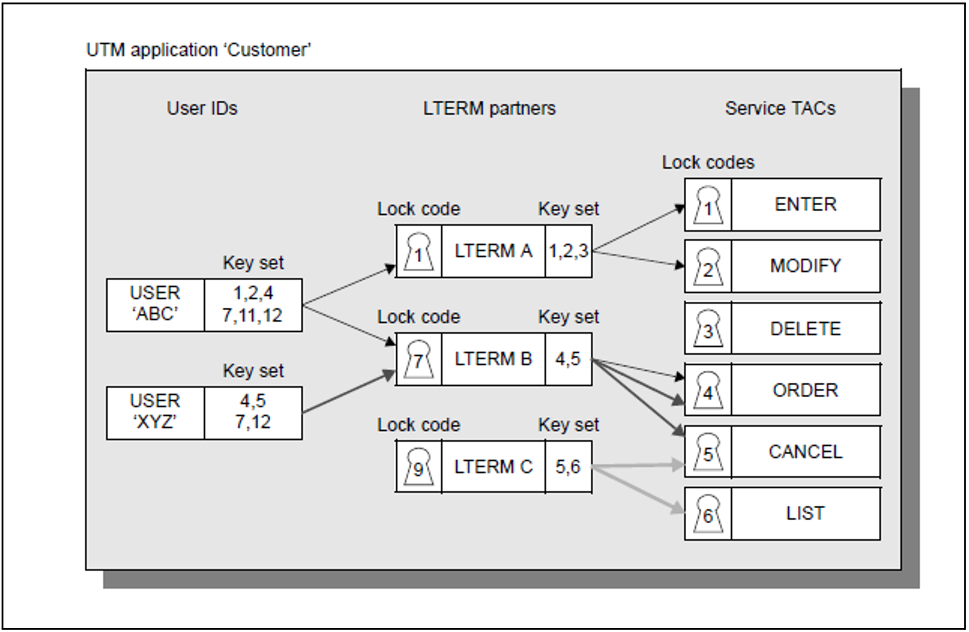 A terminal user or a client program can call a particular service only if the key sets of both the respective user ID and the LTERM partner contain a key code that matches the lock code of the transaction code.