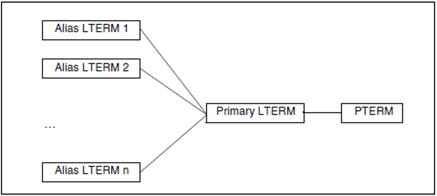 LTERMprimary, ...PTERMprimary, LTERM=primary, PTYPE=APPLI | SOCKET, ...LTERMalias1, GROUP=primary, ...LTERMalias2, GROUP=primary, ...