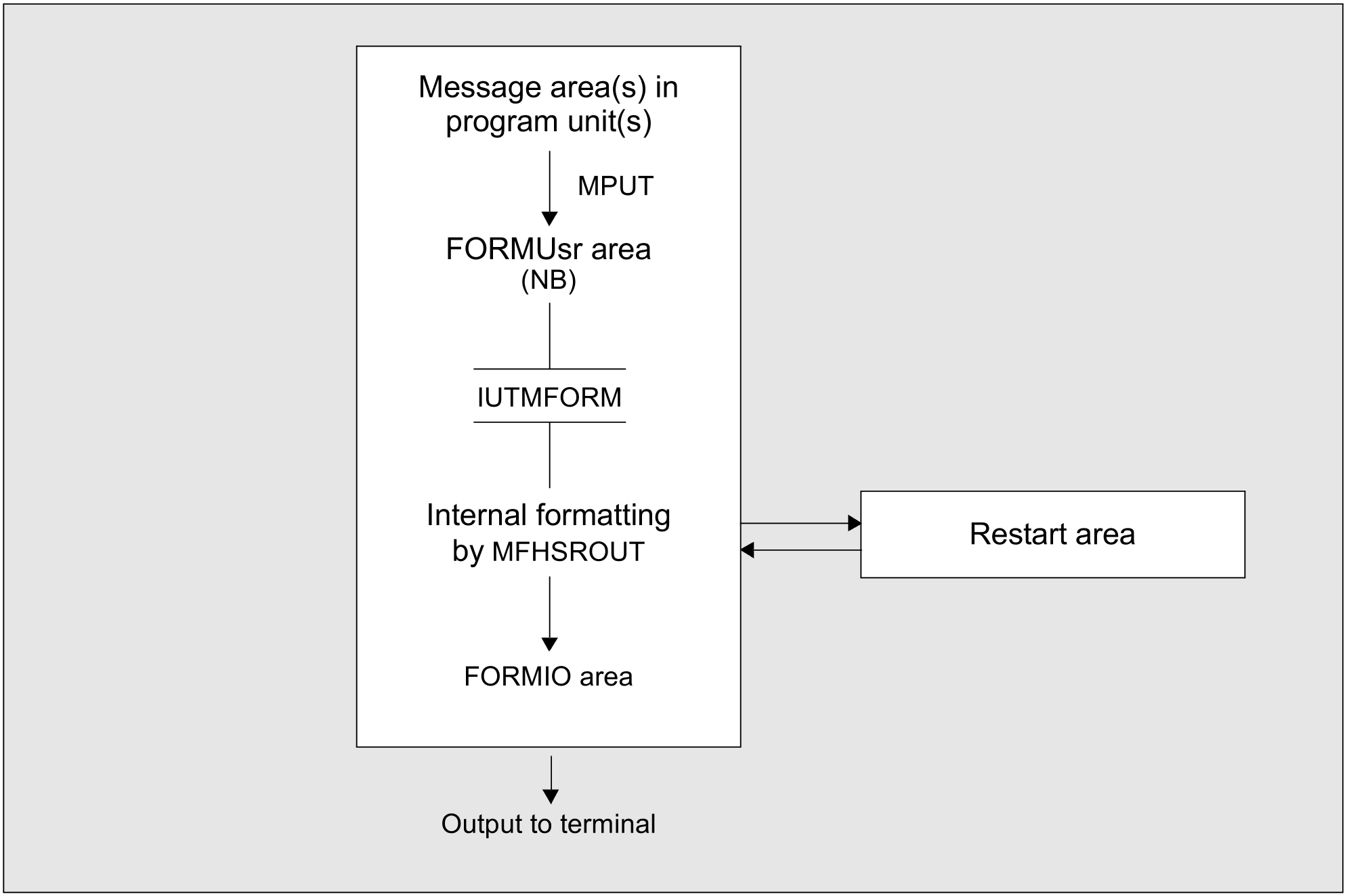 The messages from the program units enter the FORMUSR area via UTM buffers at MPUT time. The size of this area, which must be able to contain the entire logical message, is defined in the NB parameter of the MAX statement (see the openUTM manual “Generating Applications”). This message is formatted by the FHS formatting system MFHSROUT and stored in the FORMIO area. This message is sent to the terminal.