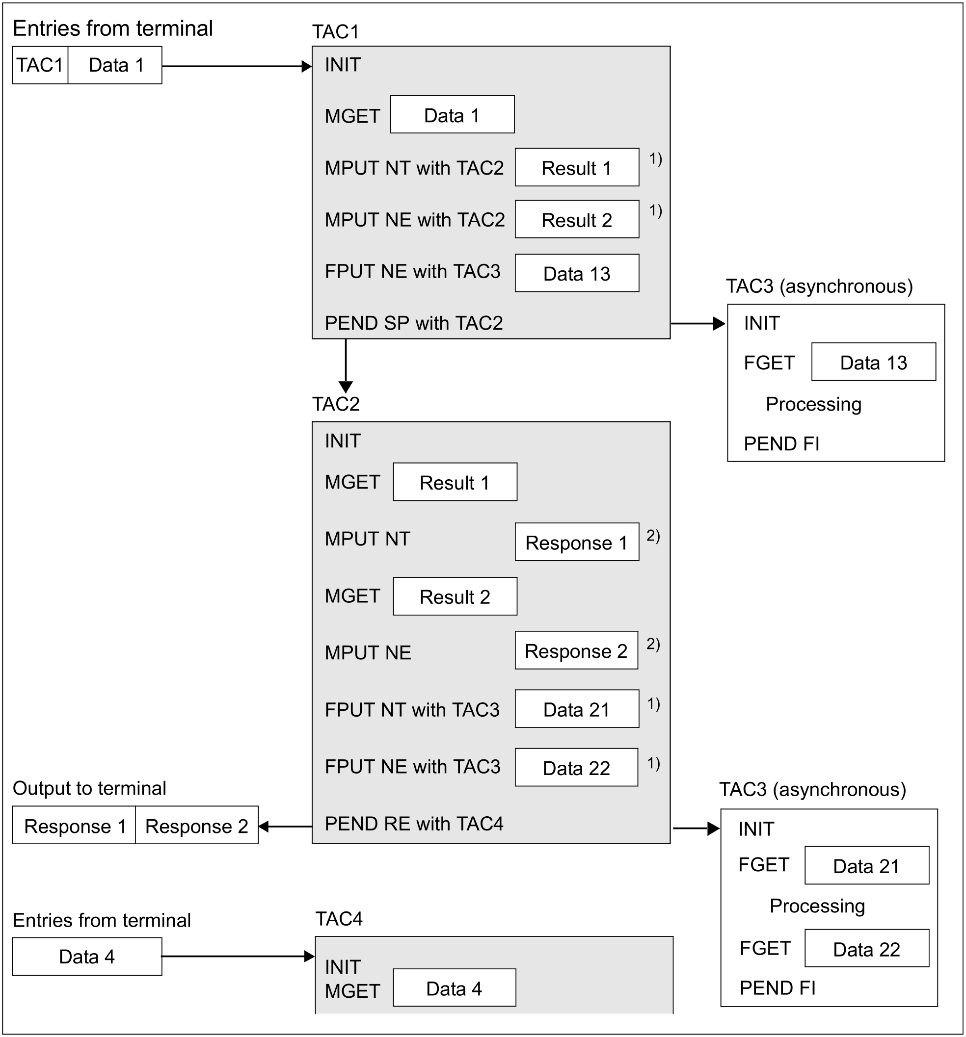 If, in the first program unit (TAC1), FPUT is written as FPUT NT, it will again produce an asynchronous message of its own since openUTM terminated the message with PEND PR.
