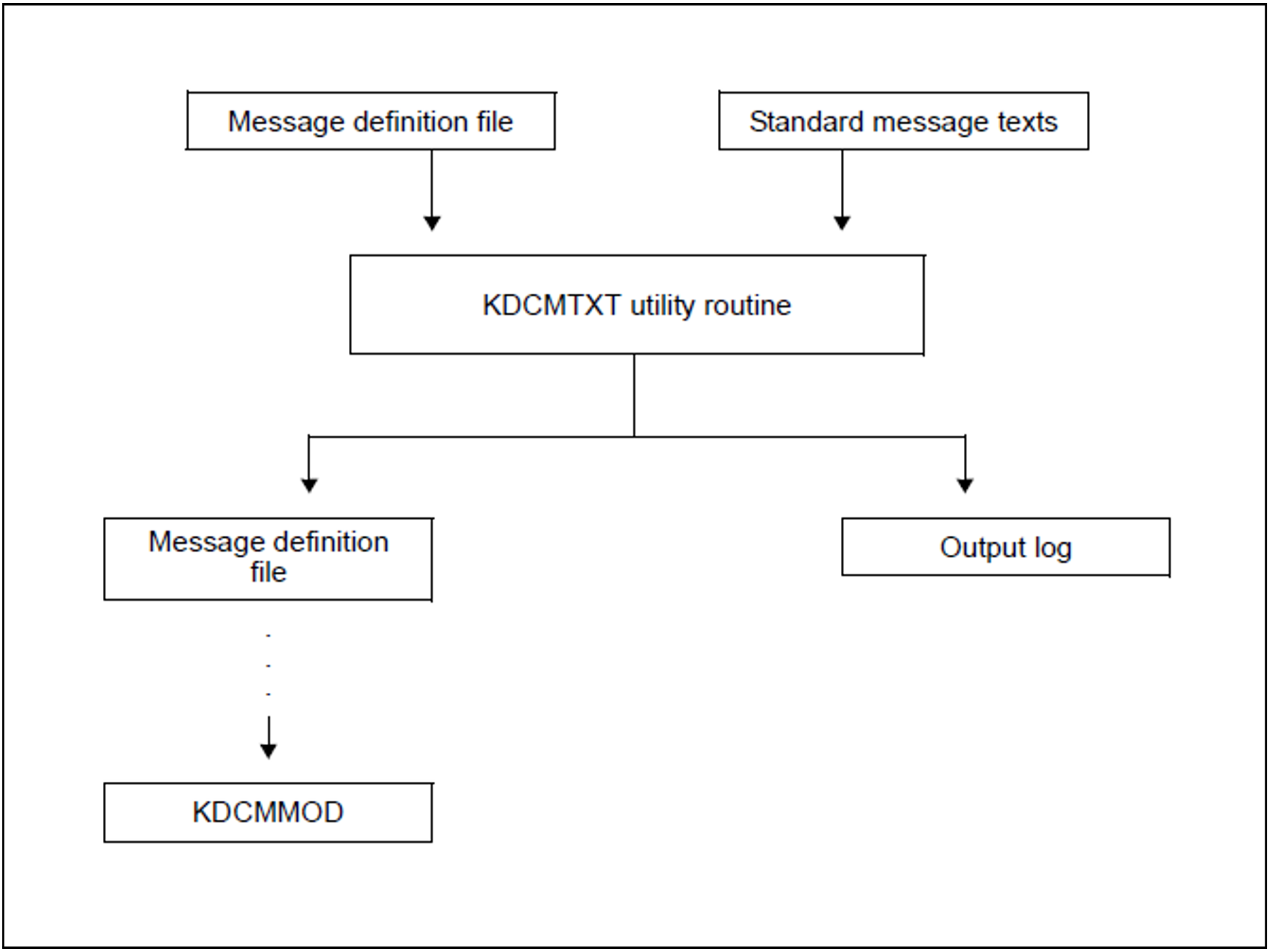 Message texts are output in English as standard (German message texts are generated using KDCMMOD). The KDCMTXT utility is a tool for adding message texts in other languages to the message definition file utm-path/msgdescription.