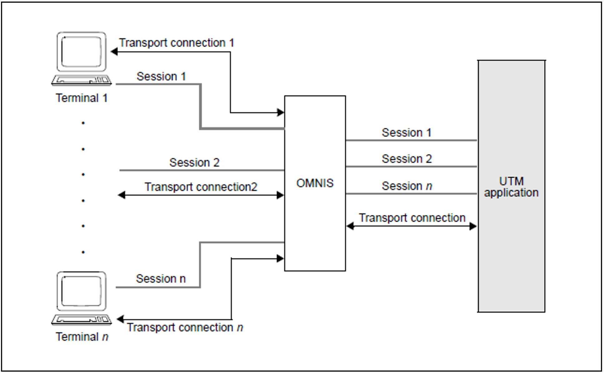 A one-to-one assignment between transport connection and session exists on the link from terminal -> Session Manager.