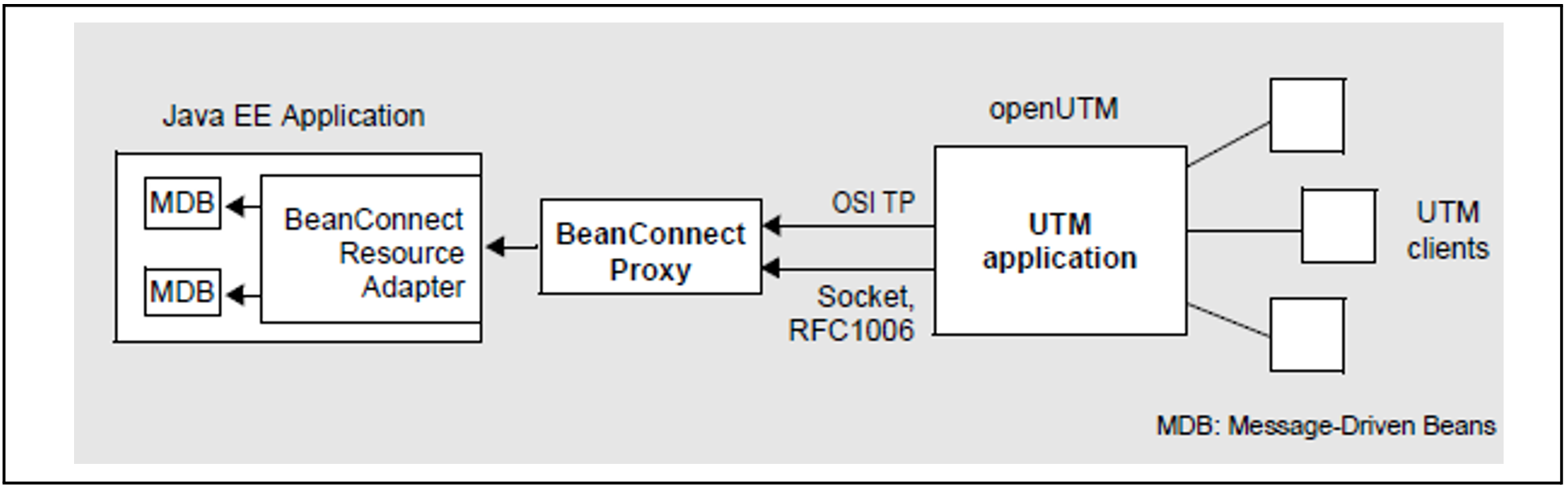 The link between openUTM and the Java EE application operates via the BeanConnect Proxy component. The messages sent by the UTM application are sent to message endpoint applications (message-driven Beans) on the Java EE application server.