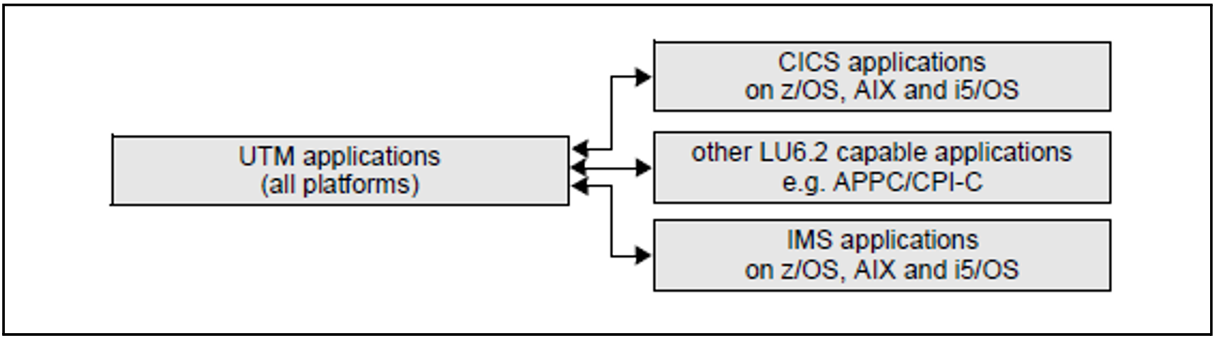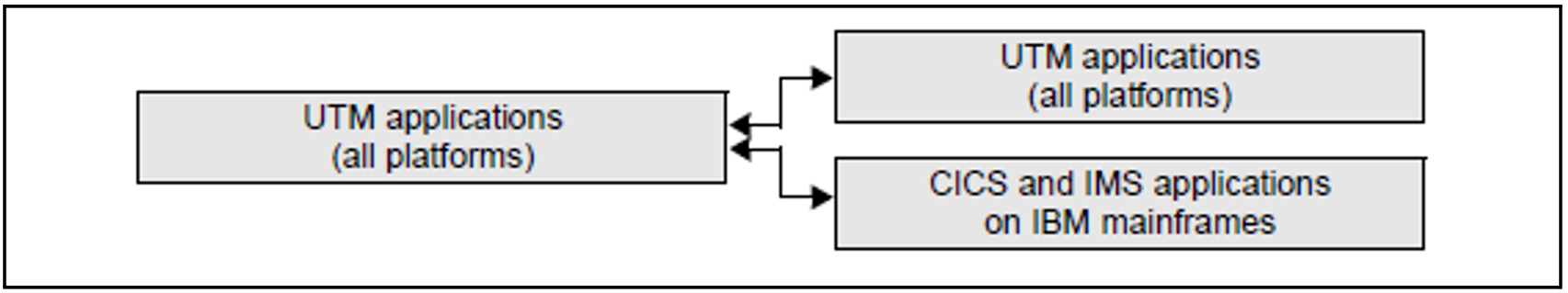 openUTM supports the LU6.1 and LU6.2 communication protocols. UTM applications can therefore interact with CICS-IMS/TM or IMS/DC applications while using transaction management. See section “Communication with CICS, IMS and TXSeries applications” for more information.