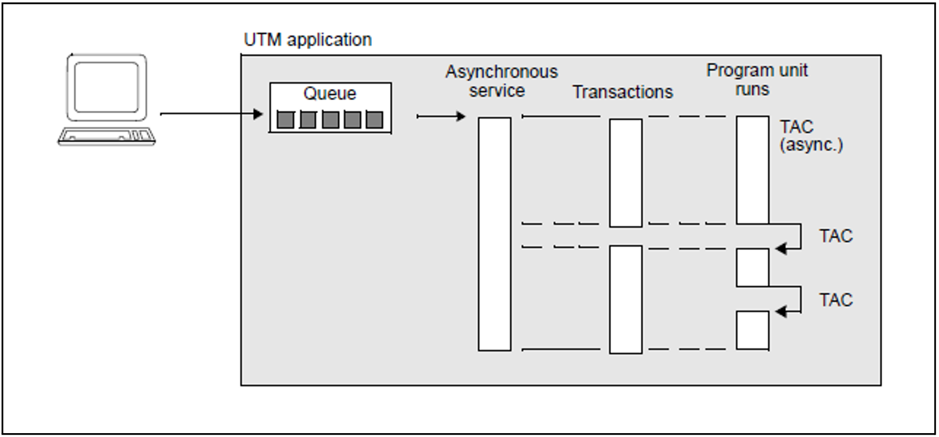 To process a background job, the UTM application starts the asynchronous service at an appropriate time. This service performs all the steps required to complete the job.