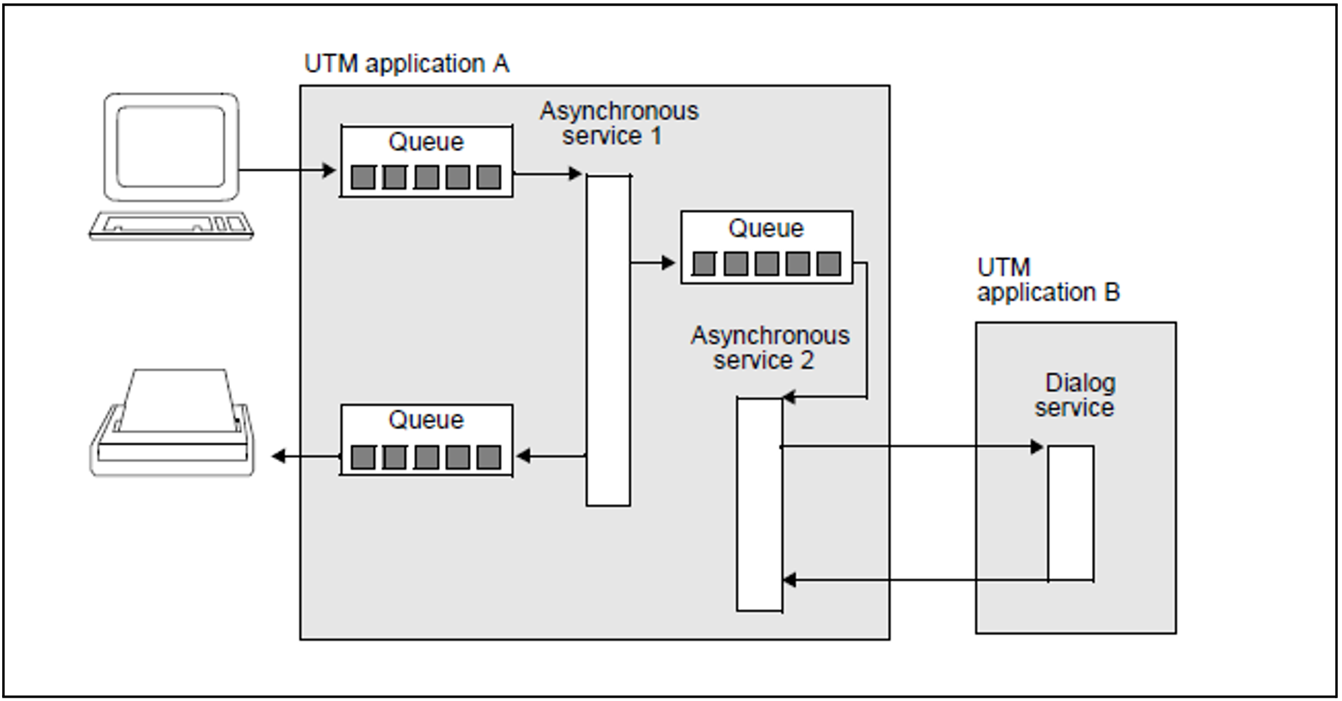 In figure 23 - as in figure 22 - a background job is sent from the terminal to a local asynchronous service. This service in turn initiates a further background job, and sends an output job to a printer. Asynchronous service 2 starts its own remote dialog service in UTM application B. This application can be located on the same system as UTM application A, or on a remote system. Even in the case of more complex structures with numerous queues, you need not concern yourself with the queuing mechanism, as this is provided automatically by openUTM.