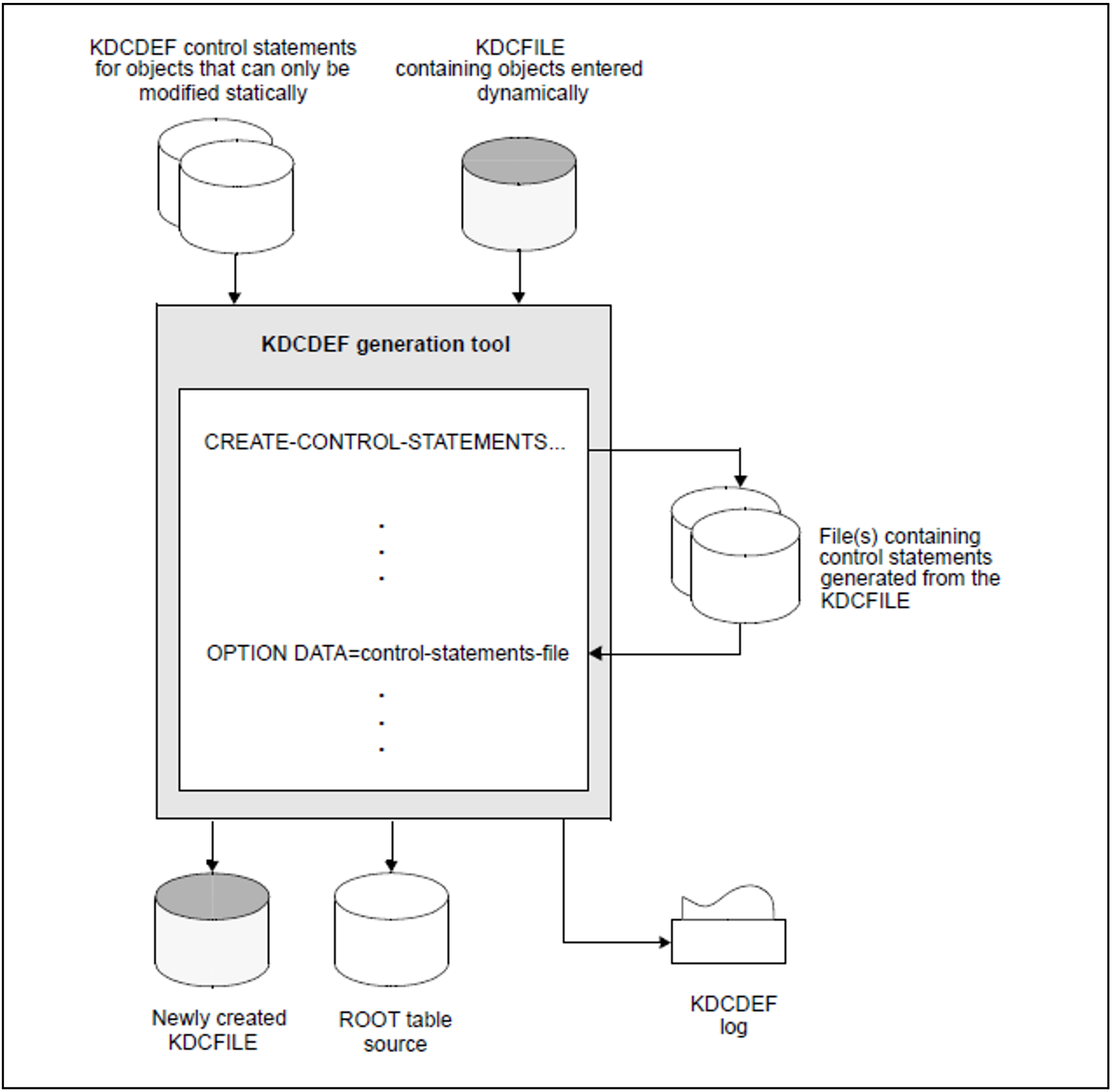 The CREATE-CONTROL-STATEMENTS statement is applied immediately. You can therefore issue the OPTION statement immediately after the CREATE-CONTROL-STATEMENTS statement in the same KDCDEF run. This transfers the files created by inverse KDCDEF to KDCDEF. For example: