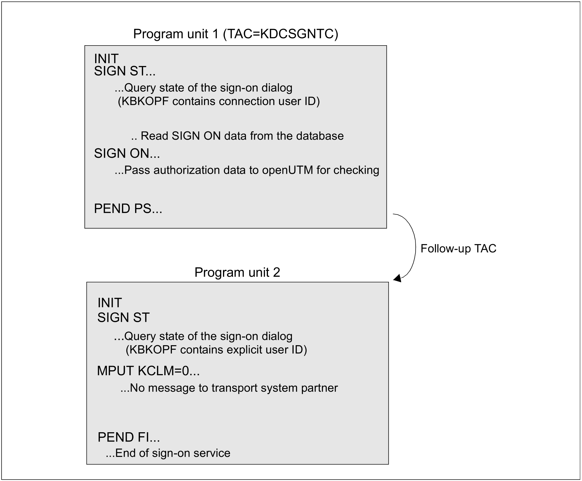 The sign-on service is terminated with PEND FC in program unit 1. The transaction code passed with SIGN ST is taken from the UPIC protocol as a follow-up TAC.