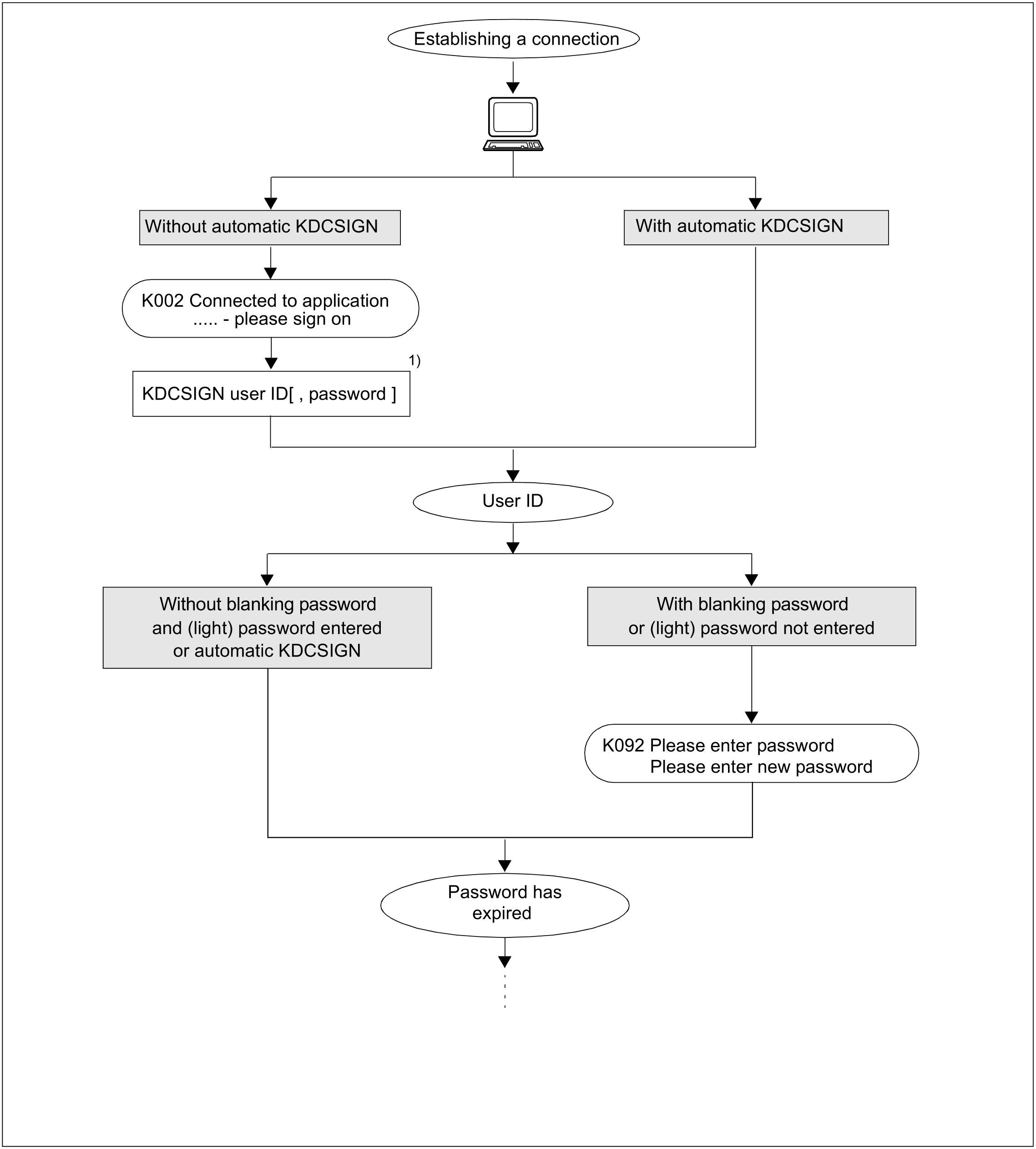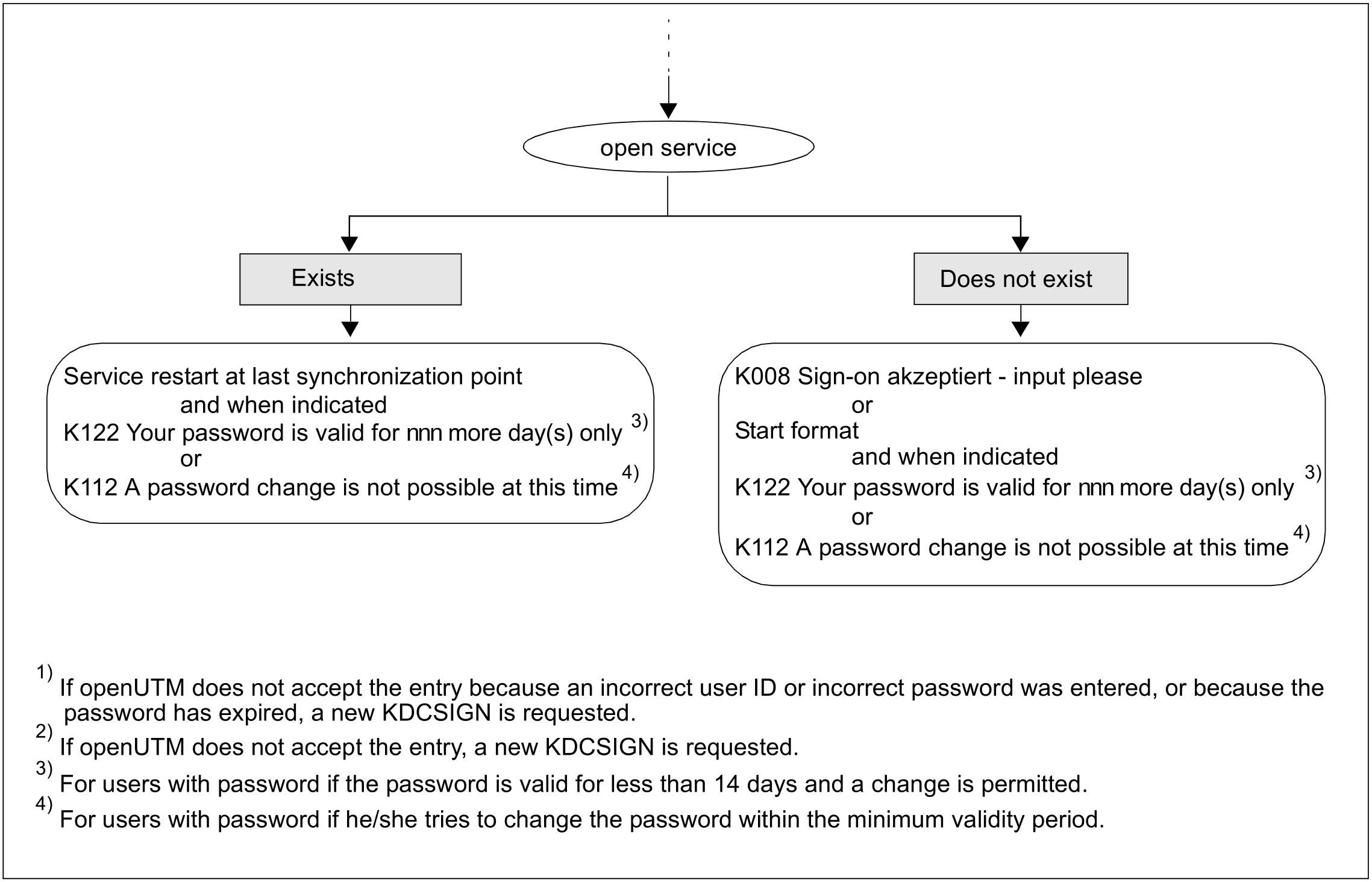 openUTM checks the user ID and the password (if there is one). If the result is negative, then the user is requested to re-enter the data for KDCSIGN. If the user is generated with a password, but the password has not been specified in the KDCSIGN command, openUTM requests the password in a blanked-out field in a second dialog step.