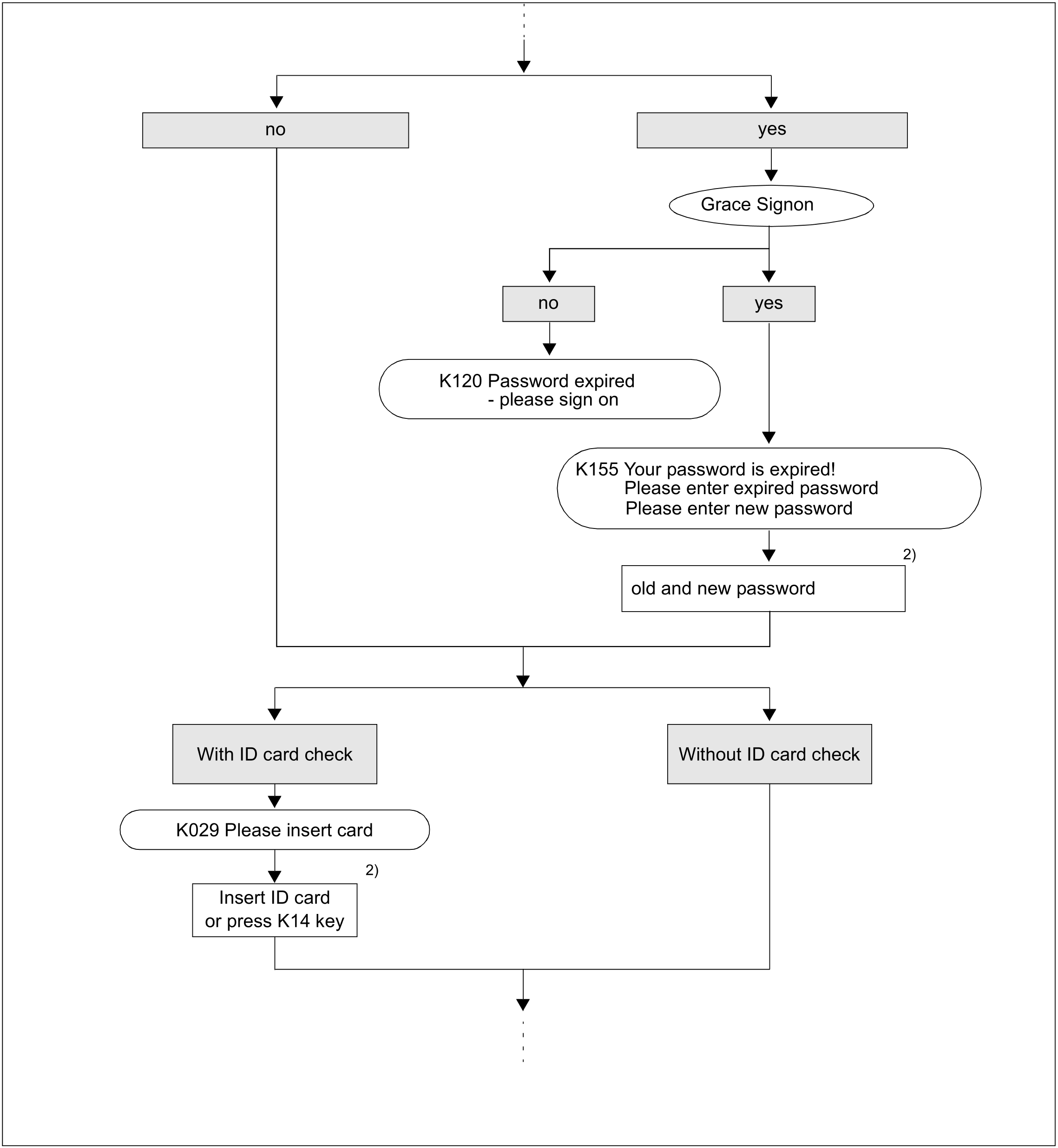 If the validity of the password has already expired when the user attempts to sign on and if the application is generated with grace sign-on (SIGNON ...,GRACE=YES), a K message informs the user that his or her password is no longer valid. The user is also asked to enter the old password and a new password. To change the password, a password must be reentered in the corresponding blanked-out field.