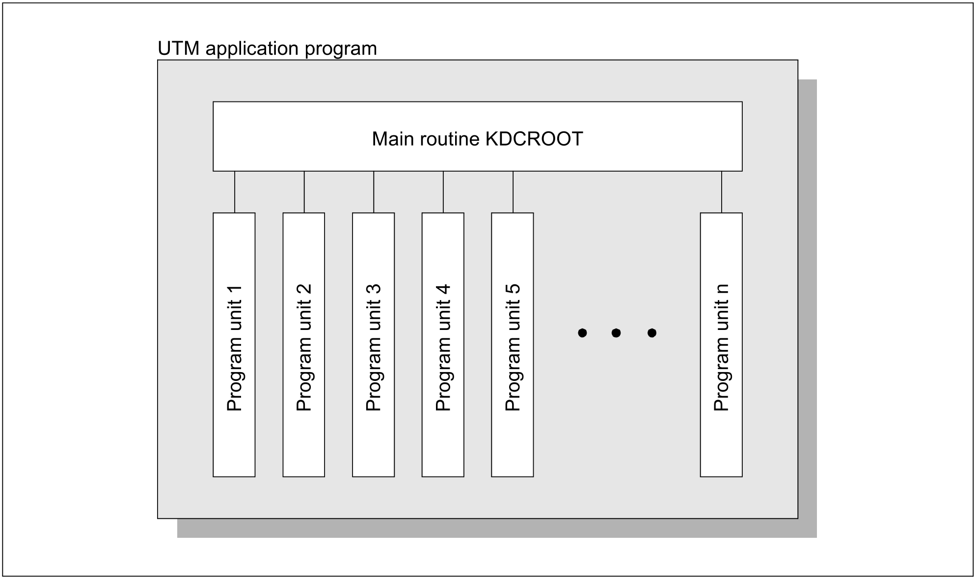 A UTM application program consists of the UTM main routine KDCROOT and the UTM program units.