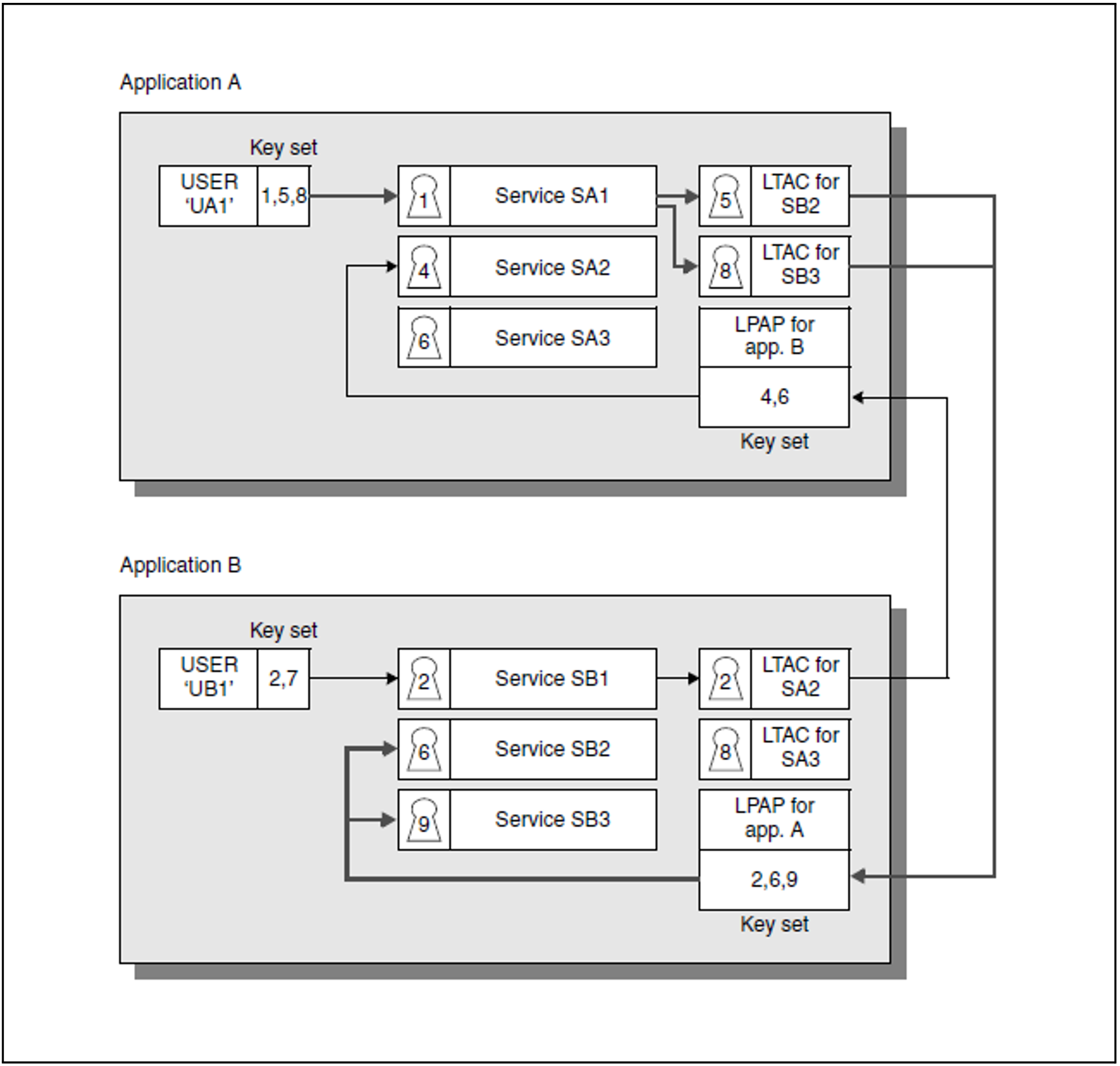 Since the user also has the appropriate key codes for the two LTACs, service SA1 can request services SB2 and SB3 via these LTACs. The key set assigned by application B to all requests from application A contains appropriate key codes for services SB2 and SB3. All requirements are thus fulfilled in the configuration of both application A and application B: service SA1 started under user ID UA1 in application A can access services SB2 and SB3 of application B.