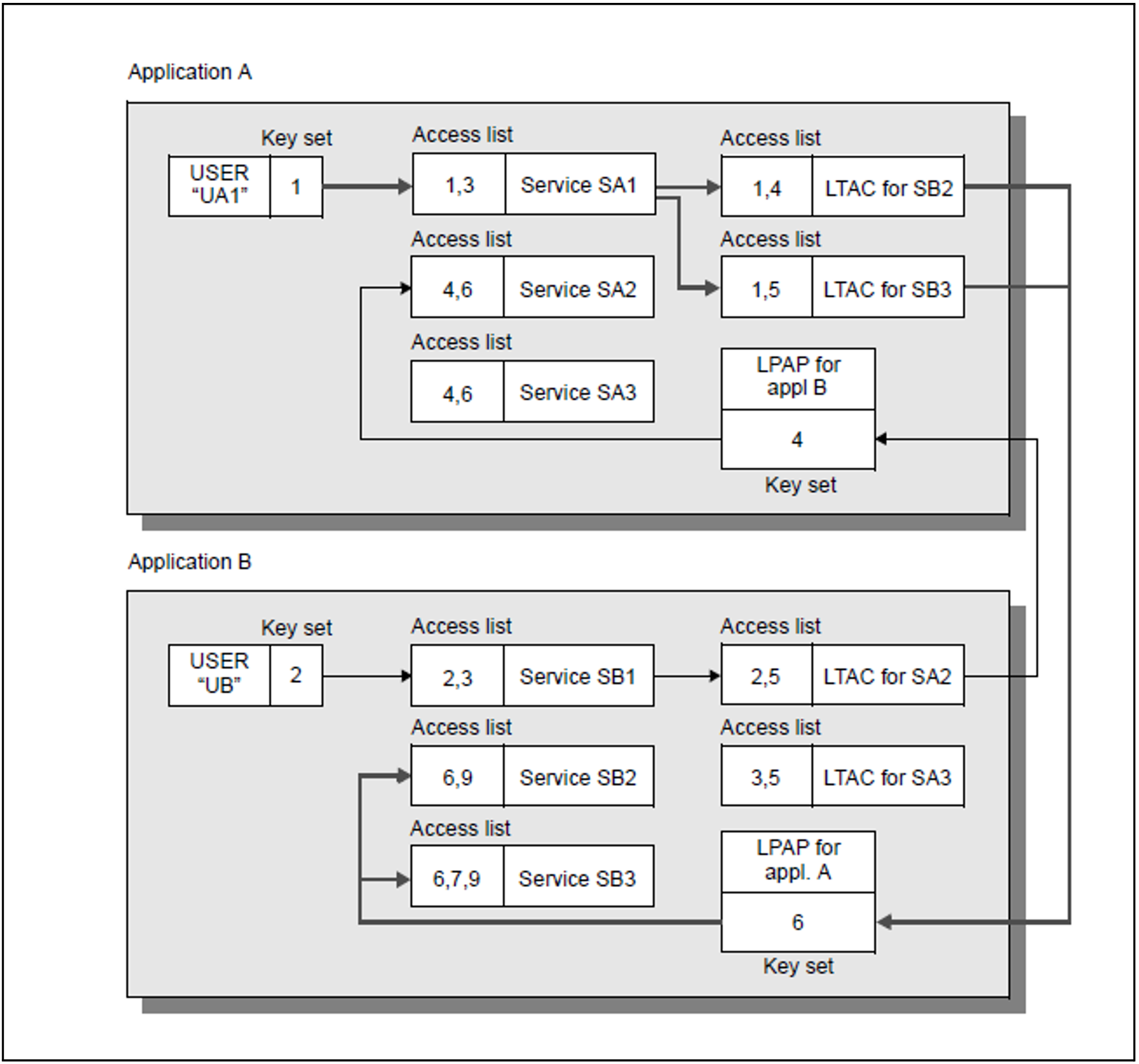 In the example shown in figure 35, server-to-server communication between application A and application B is possible, since an LPAP partner has been generated in each application for the respective remote application. In application A, LTACs have been generated only for the remote services SB2 and SB3. Service SB1 is therefore not available to application A. A user that signs on to application A under the user ID “UA1” has the key code 1, and can therefore access service SA1 in application A.