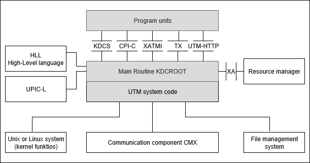 The program units access the functions via the program interfaces of openUTM, i.e. via theX/Open interfaces CPI-C and XATMI + TX or via the KDCS interface (German standard).