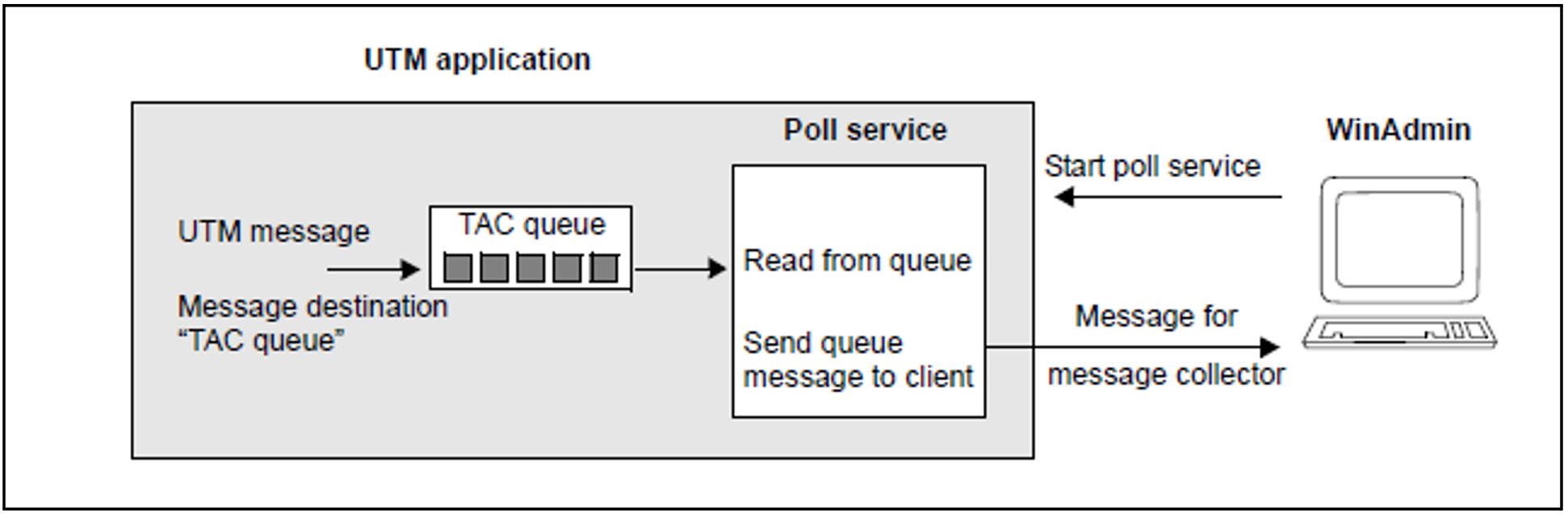 The message collector is defined in WinAdmin. It represents a polling mechanism that retrieves the UTM messages from the TAC queue either cyclically or when explicitly requested, depending on the setting in WinAdmin. On the UTM side, all that needs to be done in this case is for the TAC queue to be generated and a message module to be created in which it is specified which messages are to be sent to the TAC queue.
