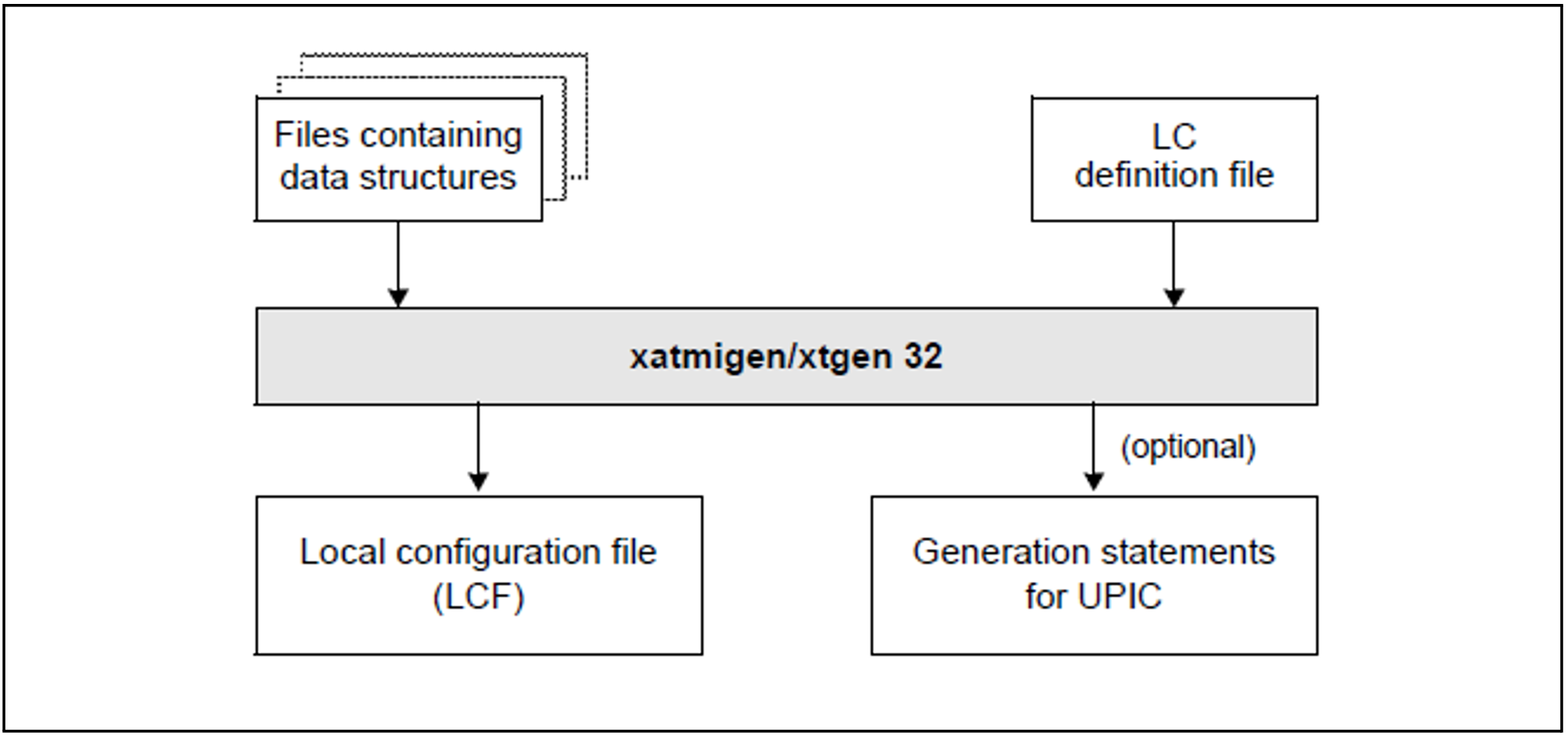 The xatmigen tool creates a local configuration file (LCF) from a file containing the local configuration definition (LC definition file) and one or more files containing C or COBOL data structures (LC description files), see diagram below: