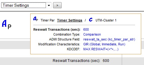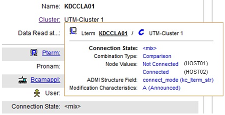 If the property was read from a data structure of the UTM administration interface KDCADMI (this is the case for most properties), then the name of the field within the structure followed by the structure name in brackets is shown next to "ADMI Structure Field". If necessary, this information allows you to look up the exact meaning of the values in the UTM Administration Manual.