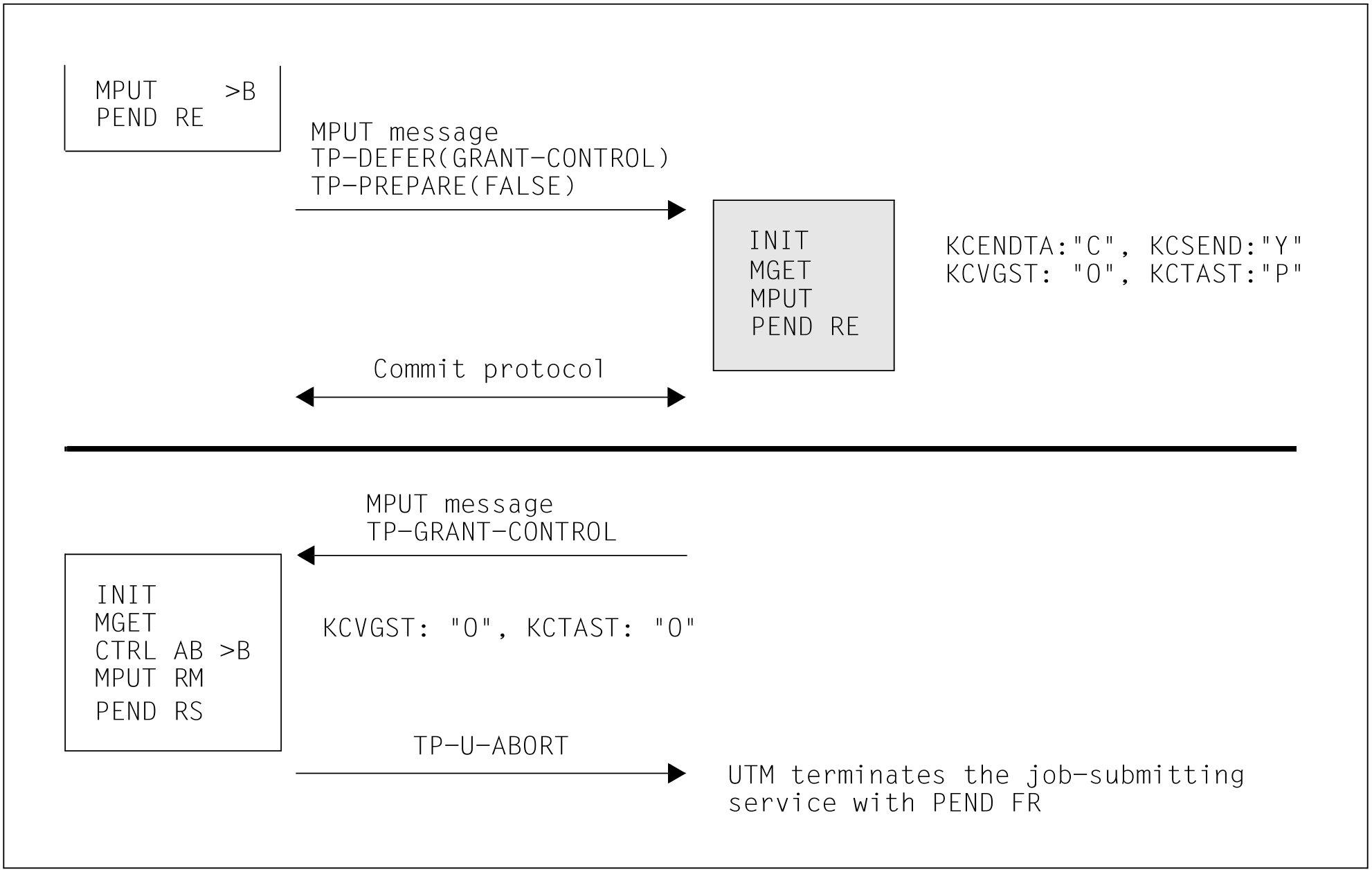 CTRL AB terminates a job-receiving service abnormally. The job submitter must roll back the distributed transaction after a CTRL AB for a job receiver for which the functional unit Commit is selected. No rollback is necessary for a job receiver dialog without Commit.