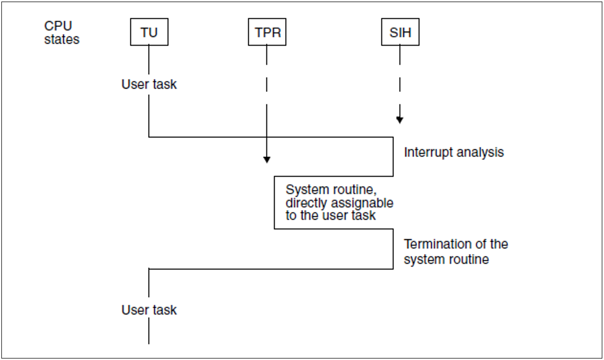 System routines which may be assigned directly to the user task (e.g. SVC: RDATA) are processed in CPU state TPR (see figure 5).