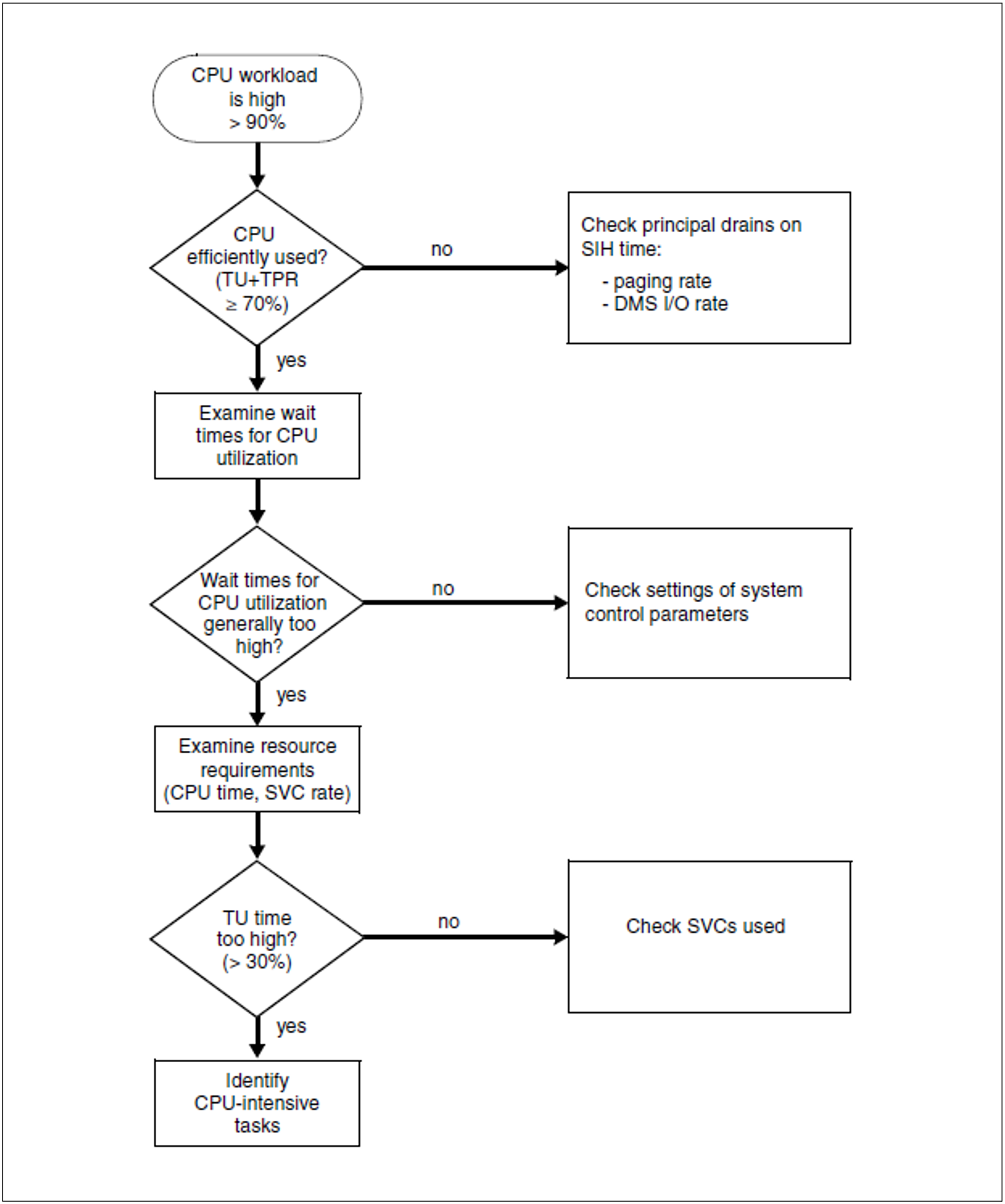 If you have determined that the rate of CPU utilization is high (the number of CPUs used by BS2000 must match the number of actually available CPUs), you must first check whether the CPU resources are being used efficiently. You can do this by studying the relationship between the workload in processor states TU and TPR and the workload in processor state SIH (see the notes on "Report group CHANNEL").