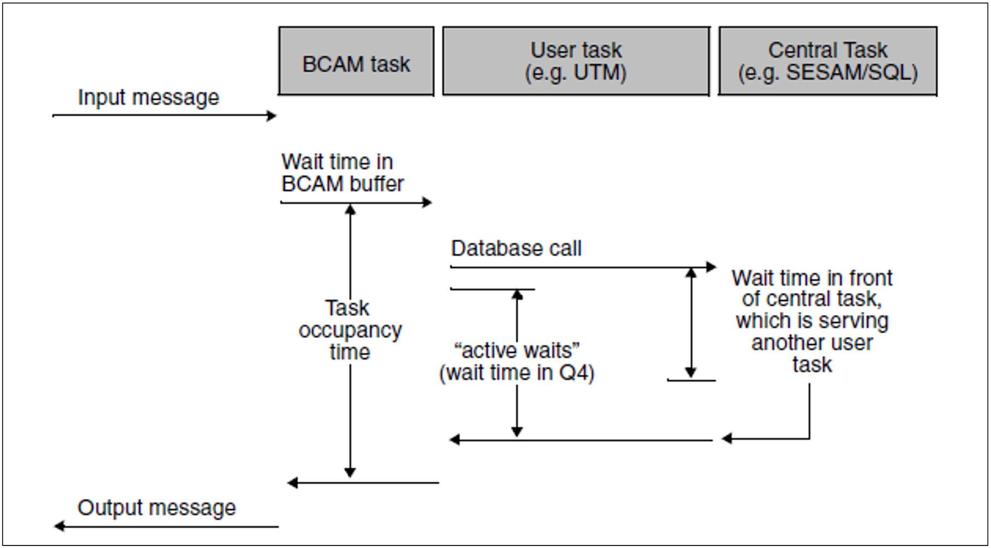 Often wait states can be detected by the increasing number or duration of “active waits” computed by the SM2 monitoring program TASK for the calling tasks. In the case of TP tasks, the number of “active waits” also contains not only those “waiting for input/output” but also those “waiting for terminal input”. This portion is negligible when the central task has a long task occupancy time.