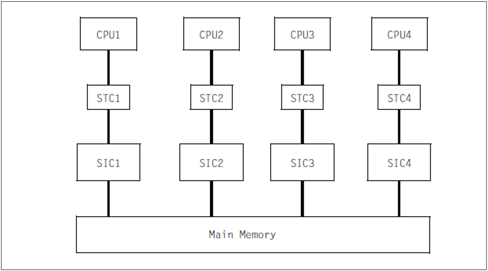 Figure 9: Cache hierarchy in a quadroprocessor with First-Level Store-Through-Caches and Second-Level Store-In-Caches