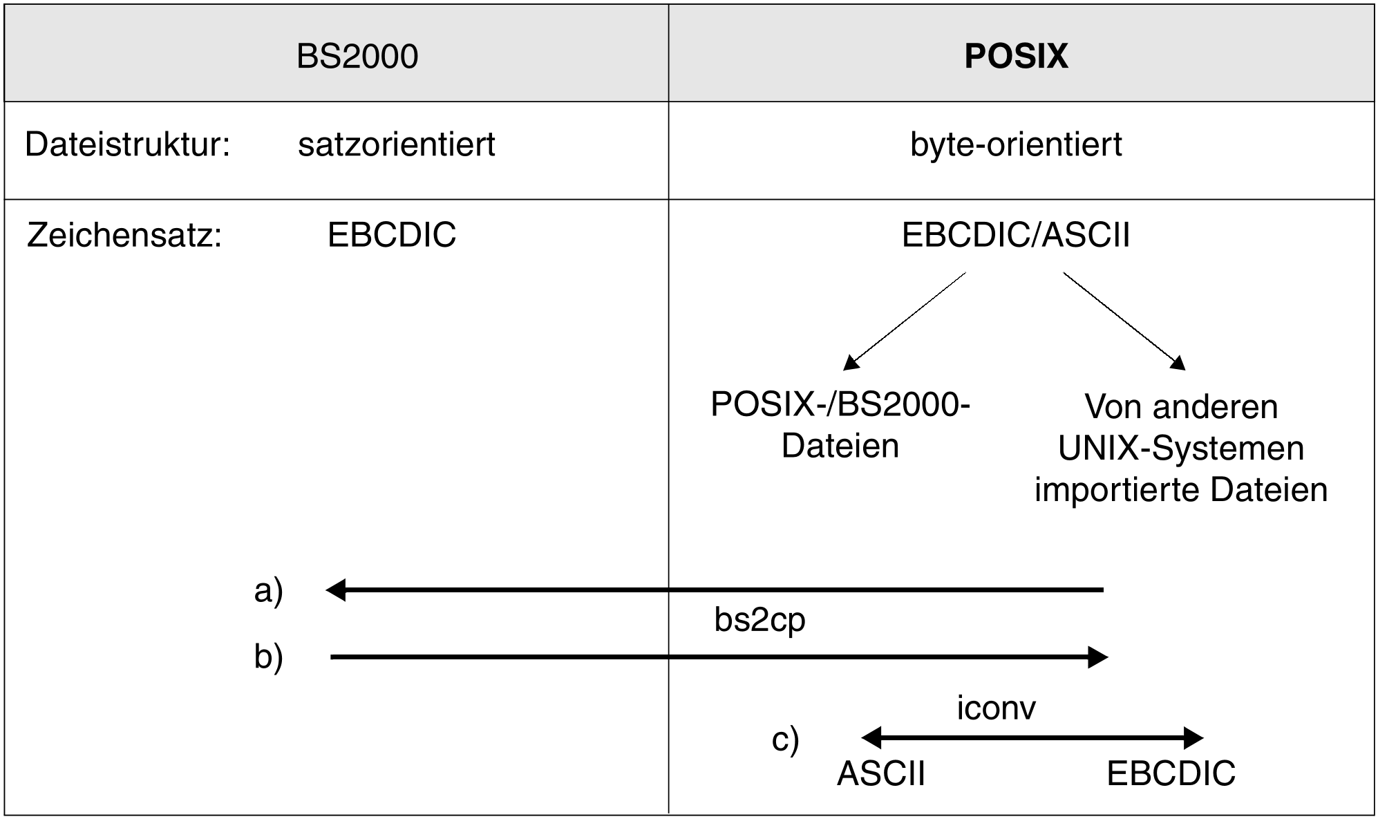 POSIX-Dateien enthalten keine Datensätze, sondern sie sind byte-orientiert. BS2000-Dateien dagegen enthalten satzorientierte und/oder PAM-Block-orientierte Daten.