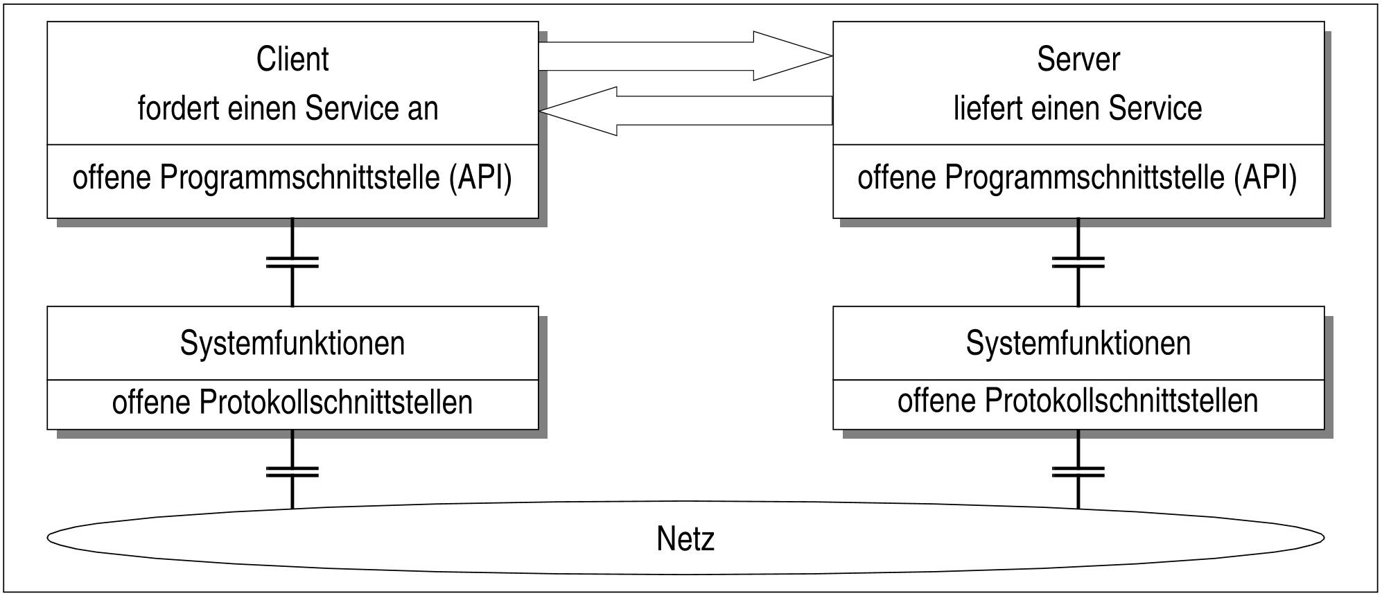 Innerhalb dieses homogenen Ganzen stellen die Server verschiedene Dienste zur Verfügung, die von den Clients genutzt werden. Server-Funktionen werden überwiegend von Mainframe- und UNIX-Systemen ausgeübt. Client-Funktionen haben vor allem PCs und Workstations, aber auch UNIX-Systeme. Client- und Server-Systeme können beliebig kombiniert werden.