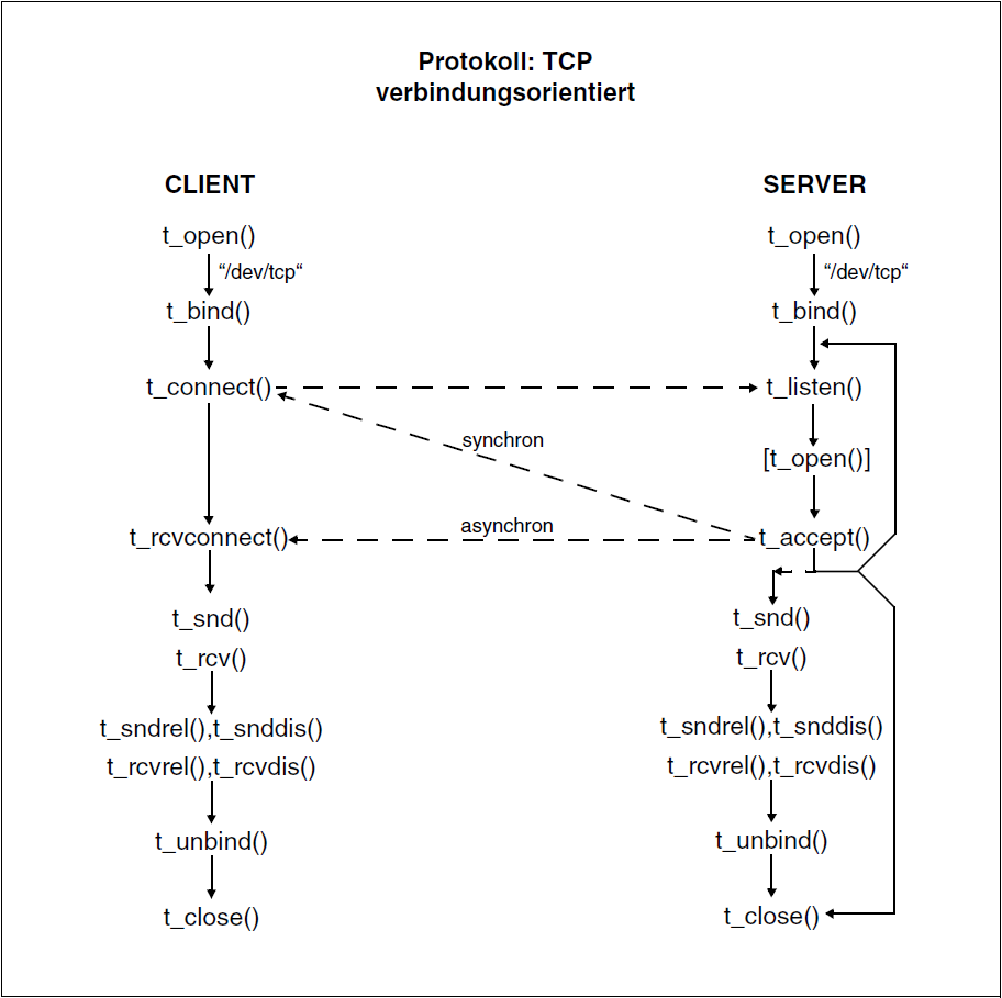 Der Client fordert mit der Funktion t_connect() eine Verbindung an. Ein Parameter von t_connect(), die Adresse, identifiziert den Server, den der Client erreichen will. Der Server muss die Funktion t_listen() verwenden, um sich von jeder ankommenden Verbindungsanforderung unterrichten zu lassen. Mit t_accept() nimmt der Server eine Anforderung zum Verbindungsaufbau an. Danach ist die Transportverbindung aufgebaut.