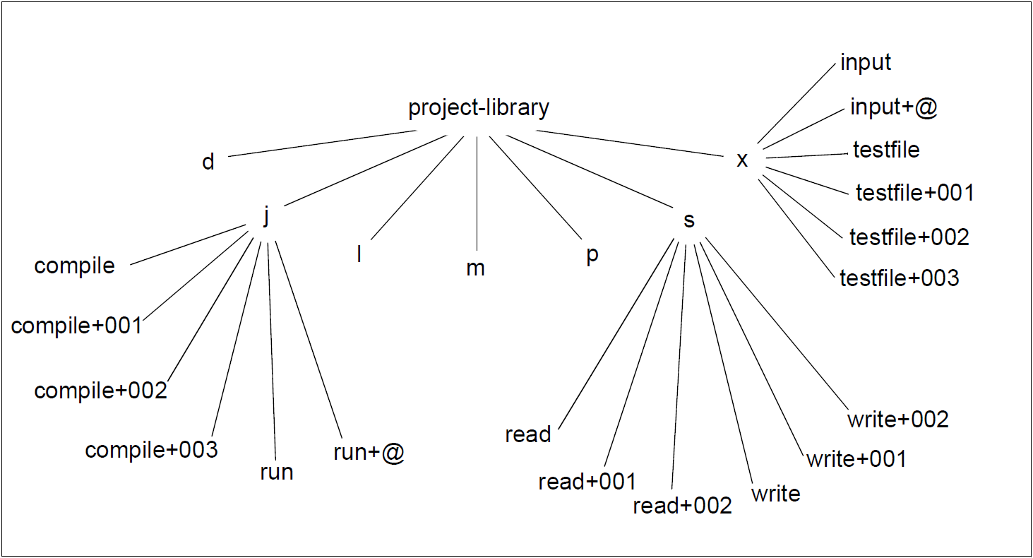 Zusätzlich enthält das Bibliotheksverzeichnis weitere Verzeichnisse mit dem Namen abgeleiteter Elementtypen, jedoch nur dann, wenn mindestens ein Element des entsprechenden Typs existiert und der abgeleitete Typ einen der Standardtypen D, J, L, M, P, S oder X als Basistyp hat.
