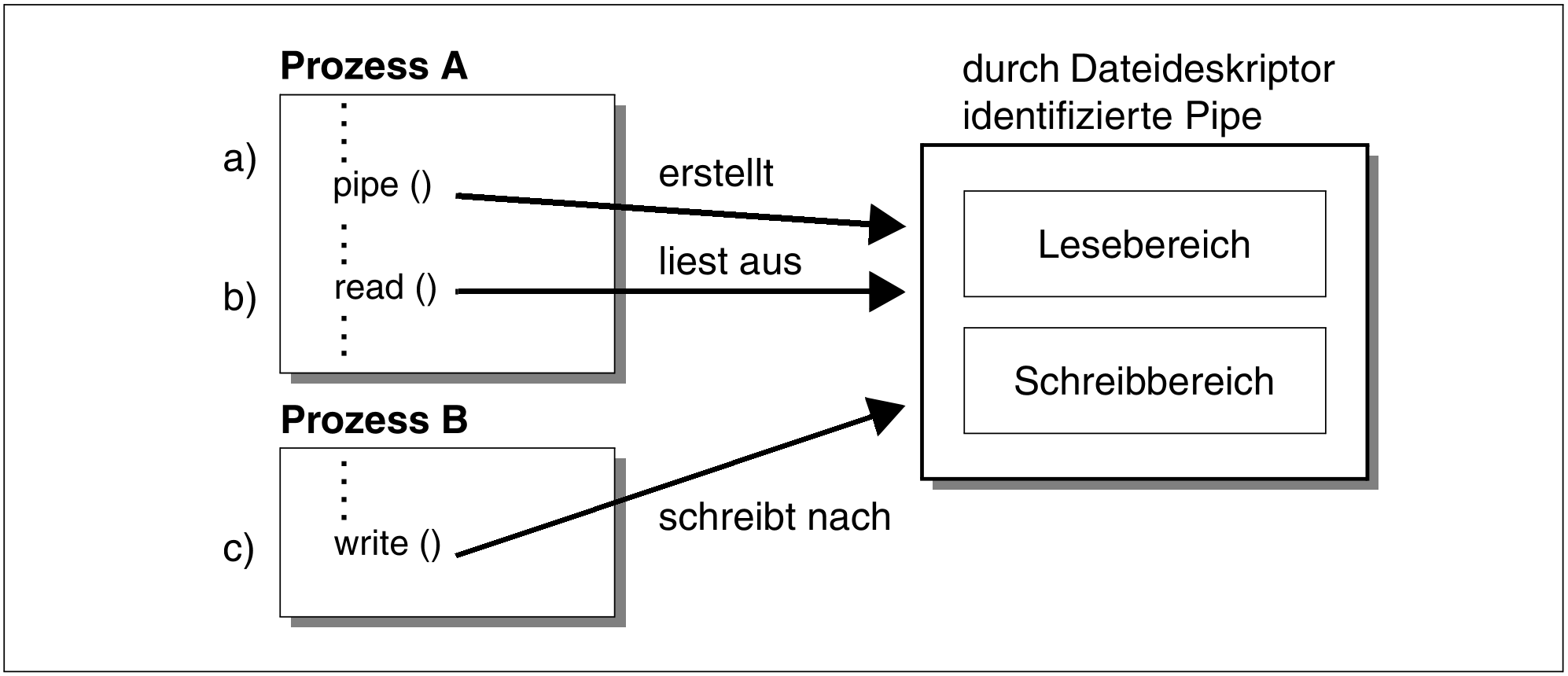 Durch den Aufruf der Funktion pipe durch Prozess A wird eine Pipe zum Lesen und Schreiben von Daten erstellt. Die Pipe wird durch einen Dateideskriptor identifiziert. Der Dateideskriptor kennzeichnet eine Datei als offen.Prozess B kann später in die Pipe schreiben und eine Nachricht hinterlassen, die Prozess A danach zu einem beliebigen Zeitpunkt lesen kann.Prozess A ruft die Funktion read auf, spezifiziert den auf die Pipe bezogenen Dateideskriptor und liest die vom Prozess B hinterlegte Nachricht.